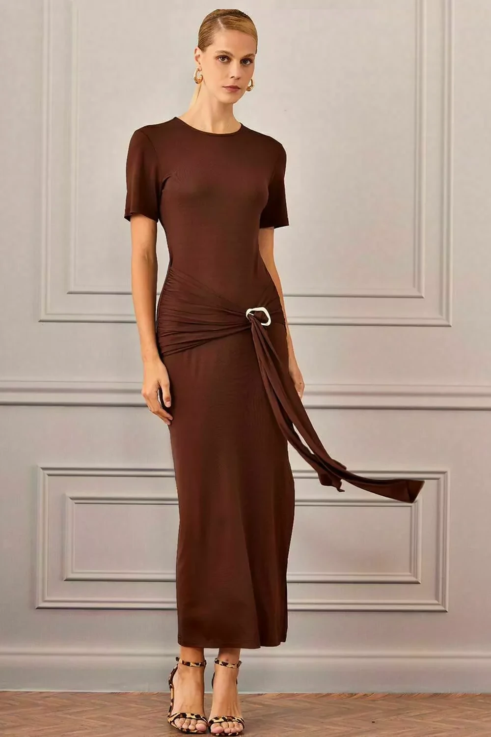 Vestido midi em jersey rayon com detalhe drapeado na cintura e fivela, Fechamento em ziper na parte posterior.