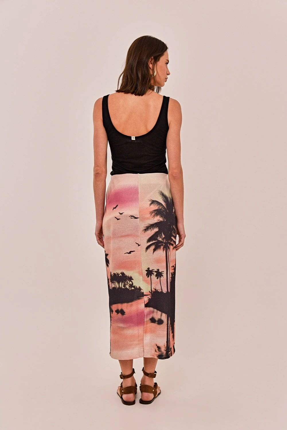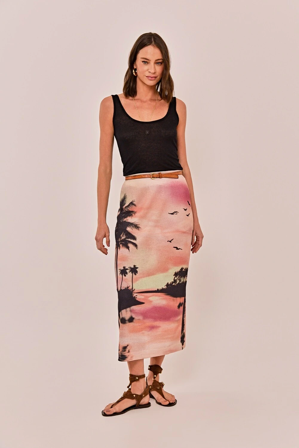 A saia Pamela é feita em malha tricot com estampa de paisagem tropical em tons de rosa e coral. Possui modelagem reta, cós aplicado de elástico e barra simples.