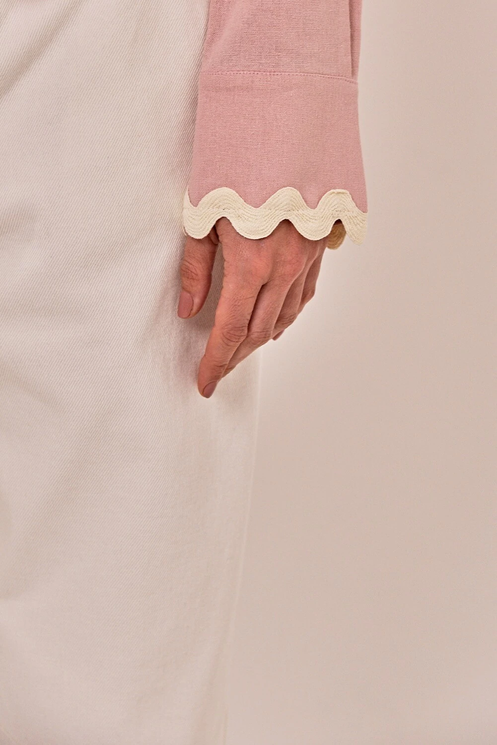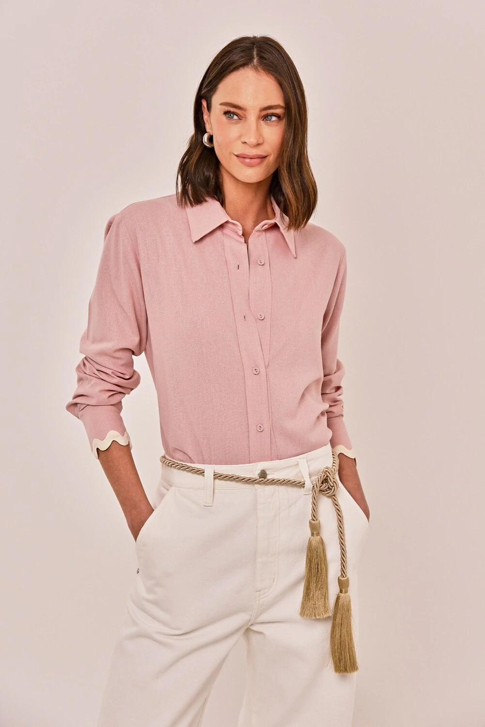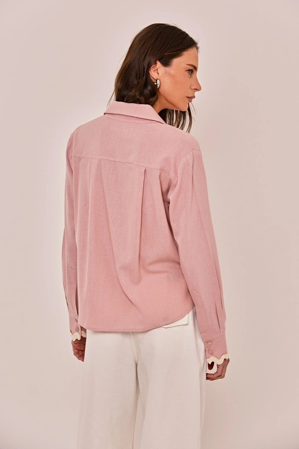 A camisa Olive é feita em viscolinho, disponível na cor rosa nude. Possui modelagem slim, mangas longas, vista de botões e acabamento simples. Detalhe de sianinha aplicada nos punhos da peça, em tom ecru.