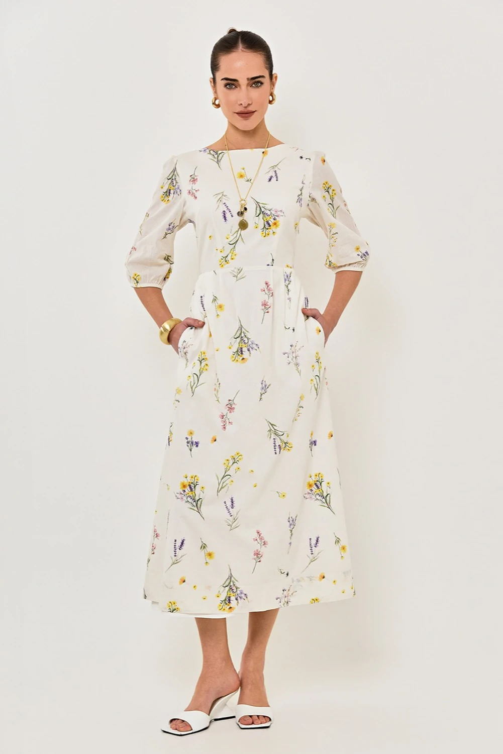 O vestido Marilyn é feito em cambraia de algodão com estampa floral, disponível na cor off white. Com modelagem evasê comprimento longo, a peça une romantismo e delicadeza. Possui decote canoa, mangas 3/4, bolsos laterais e decote nas costas.