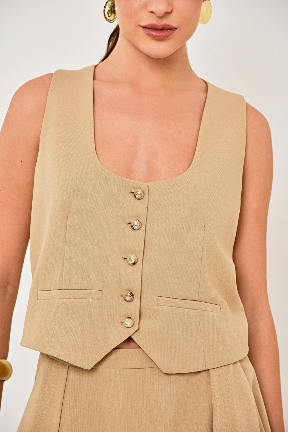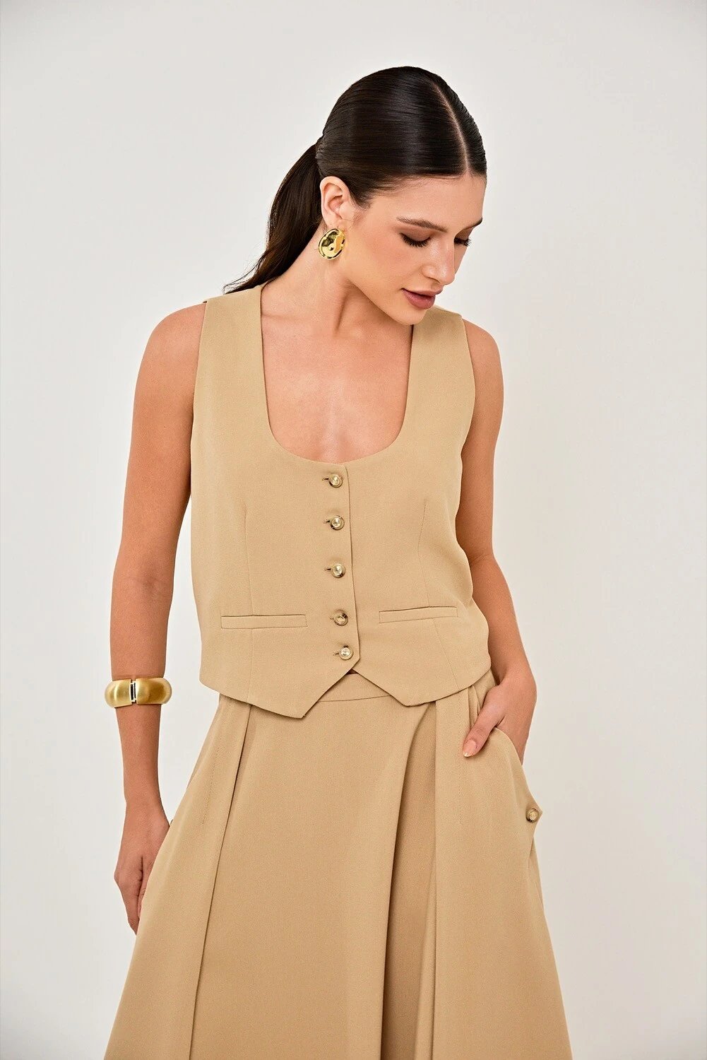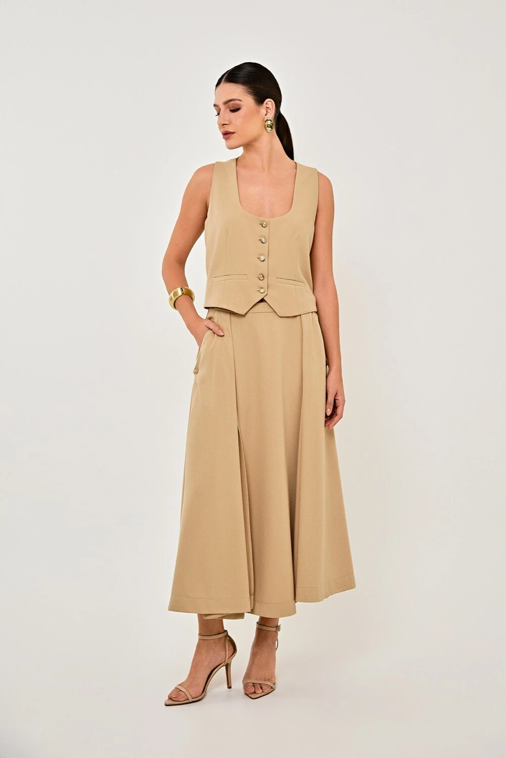 Invista no look completo. Use o Colete Lúcia com a saia Luar em mesmo tecido e cor.