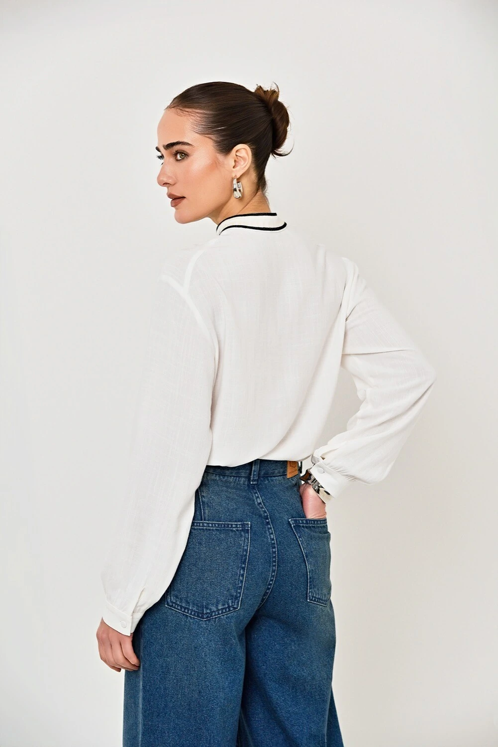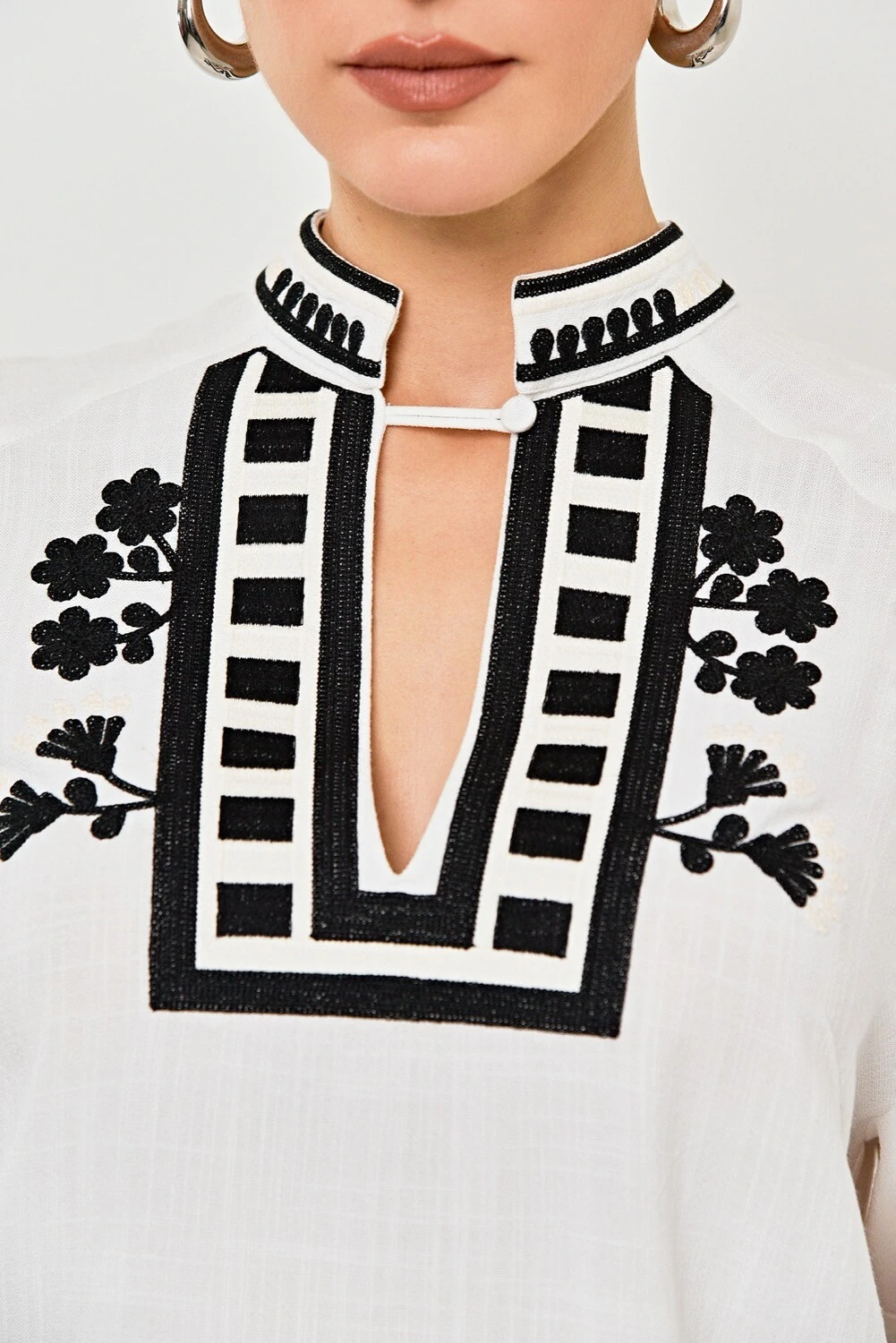 A blusa Maria Liz é feita em viscolinho, disponível na cor off white. Possui modelagem slim, decote v com gola alta, manga longa e acabamento simples. Detalhes em bordado aplicado em cor preto com padronagens florais e geométricas.