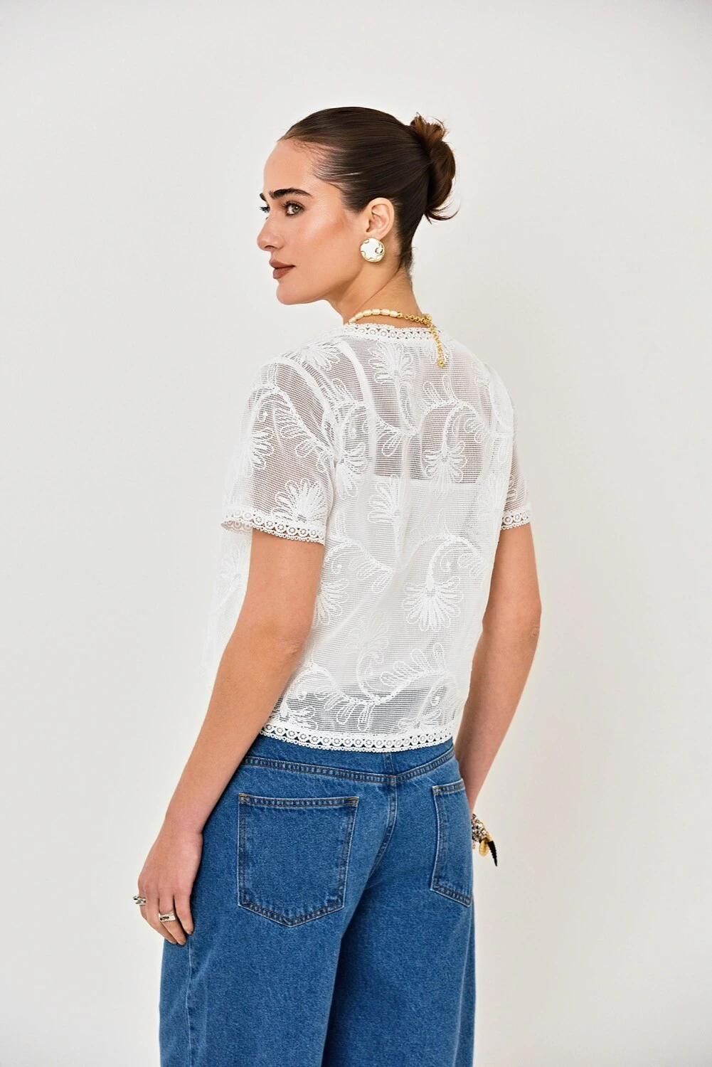 A blusa Maria Laura é feita em tela bordada, disponível na cor off white. Possui modelagem reta, gola aplicada, vista de botões e transparência. Acompanha regata base em malha off white, para utilizar como forro.