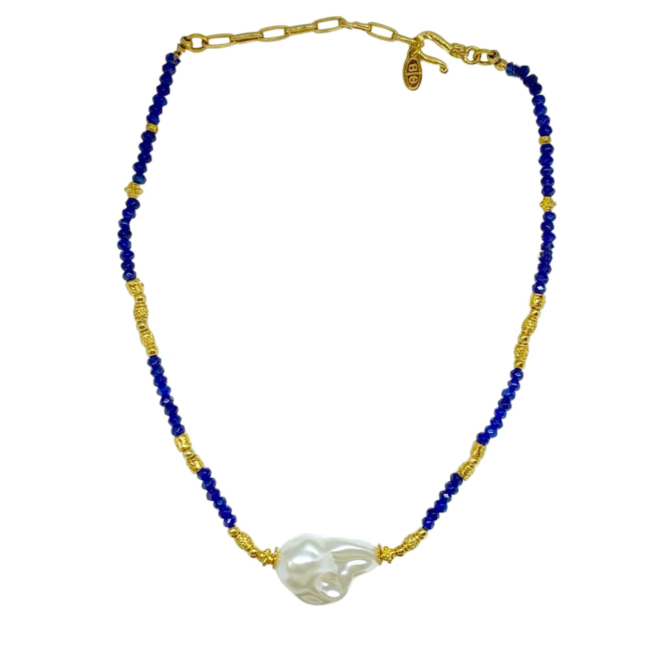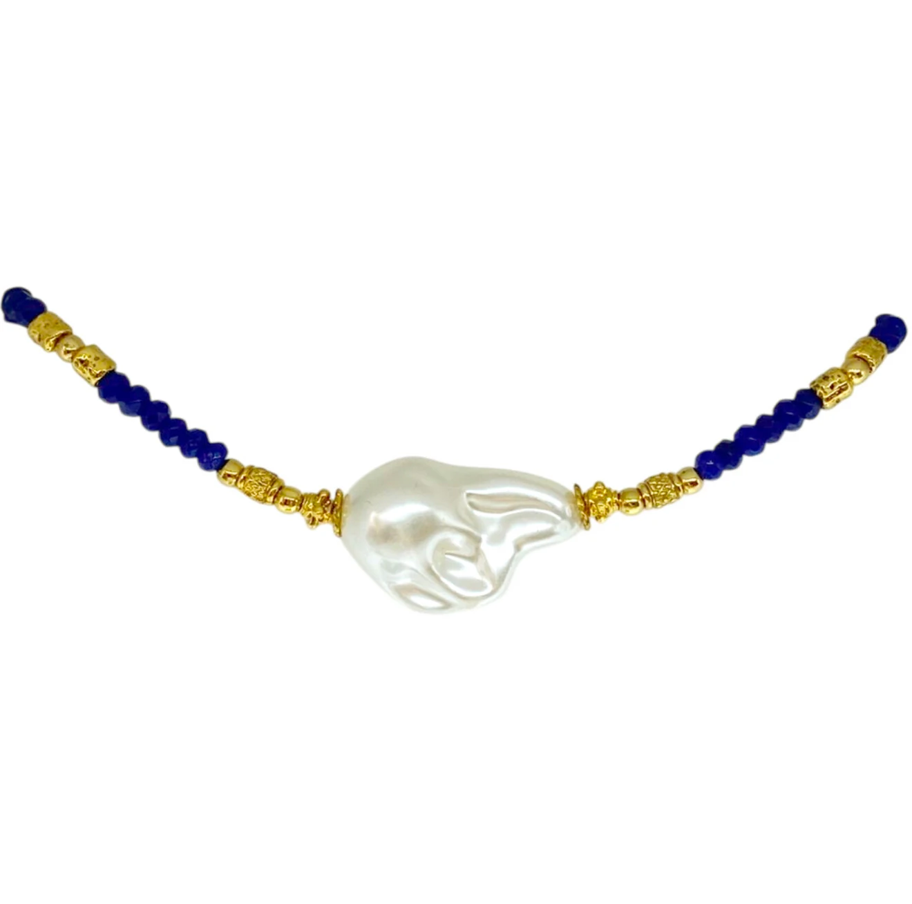 Colar estilo Choker delicado composto por miçangas na cor azul escuro, intercaladas com esferas e cilindros dourados trabalhados, trazendo um toque sofisticado e artesanal. Ao centro, uma pérola irregular de destaque adiciona charme orgânico e elegância.