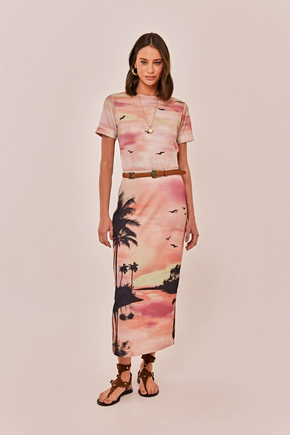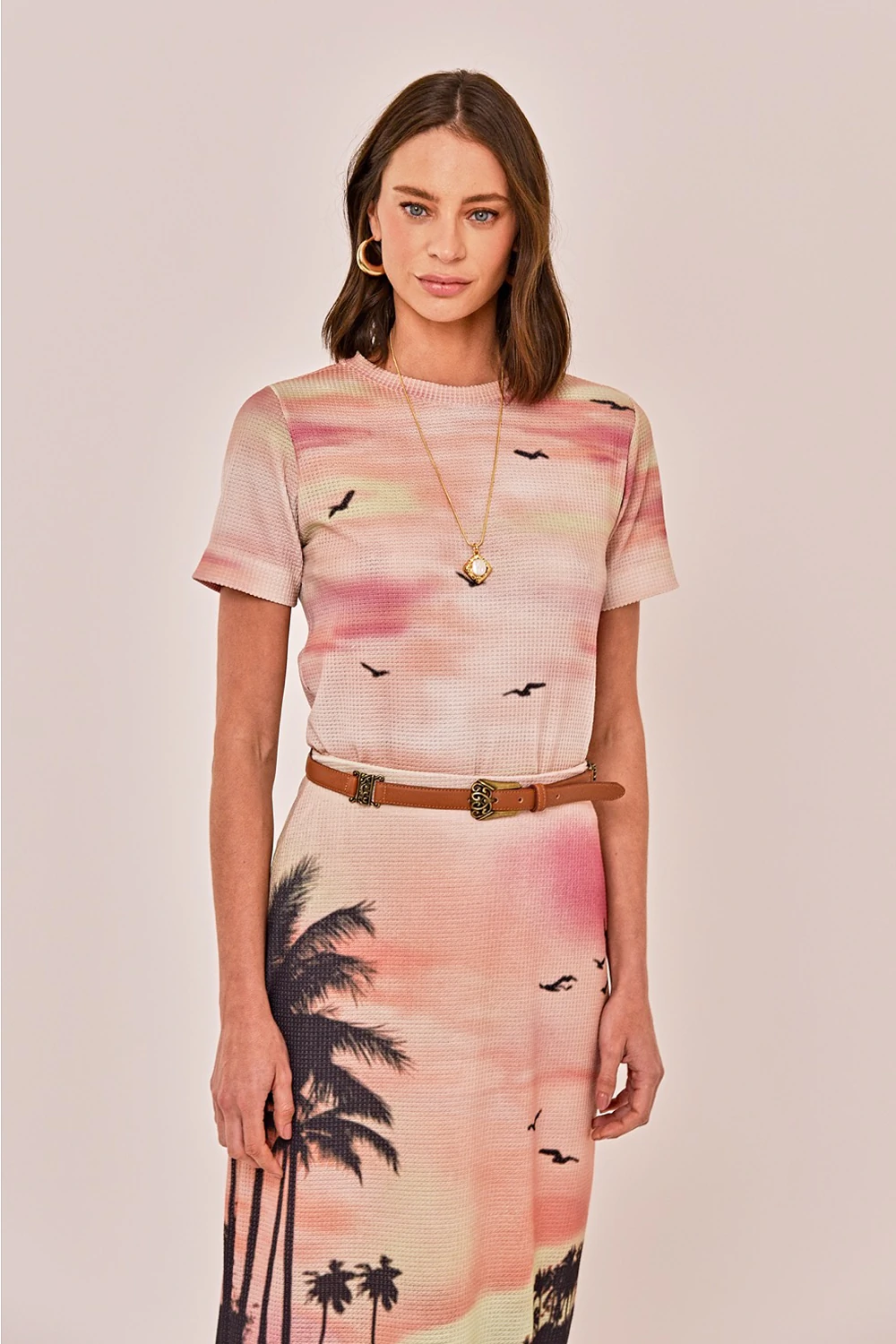 A blusa Paola é feita em malha tricot com estampa de paisagem tropical em tons de rosa e coral. Possui modelagem slim, decote redondo e acabamento simples.