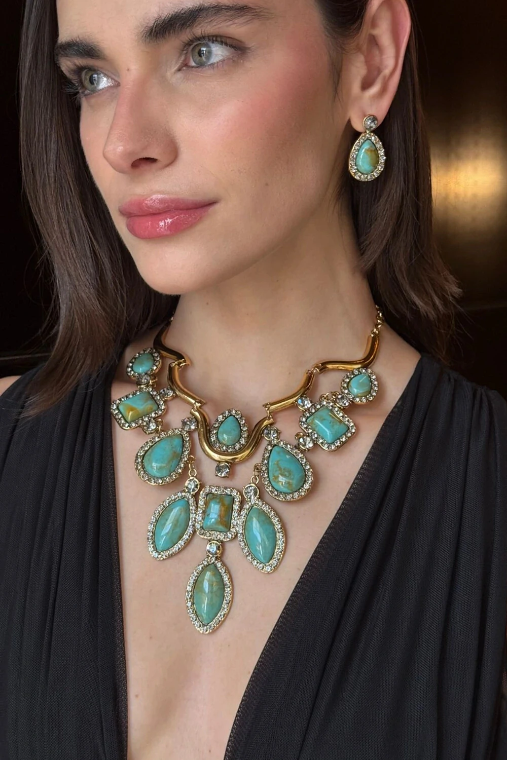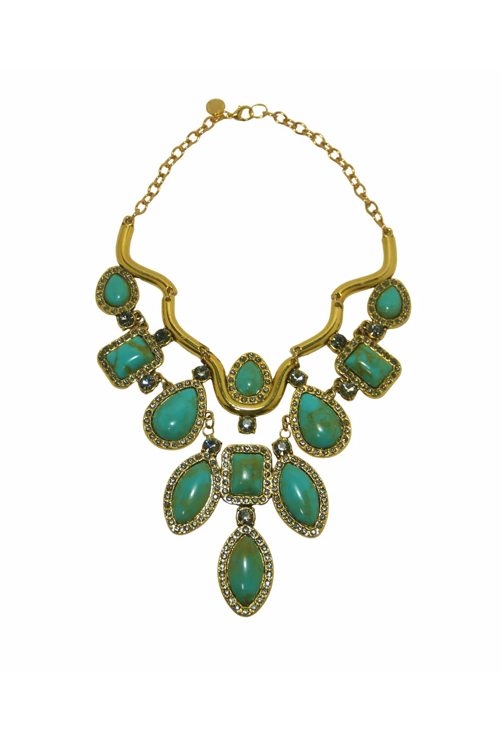 Colar curto fabricado em metal com banho ouro vintage e detalhes em cristais black diamond e resinas turquesa. Fechamento em corrente com fecho lagosta