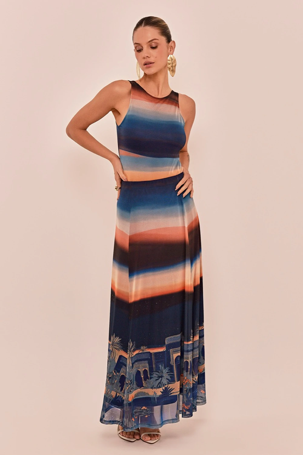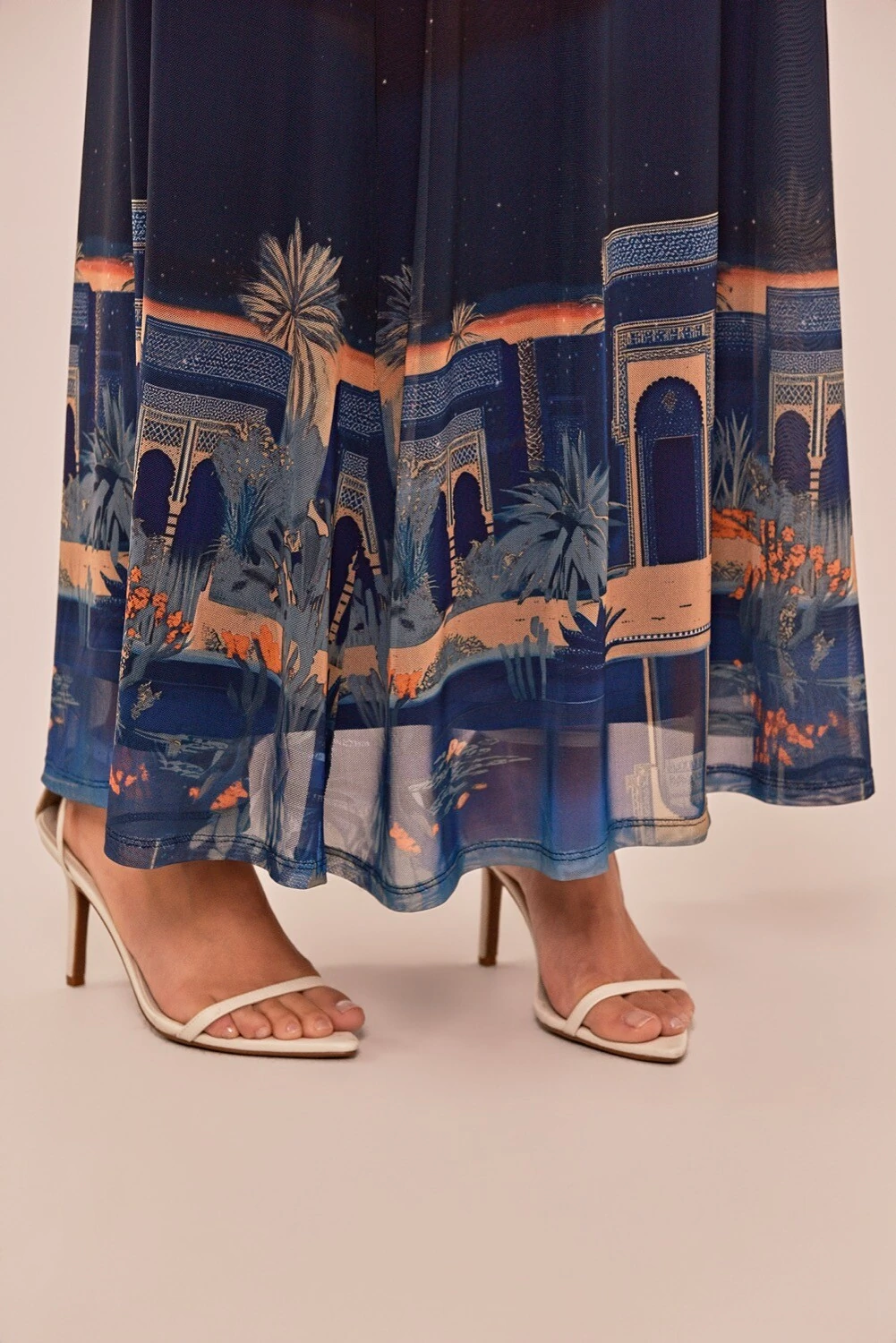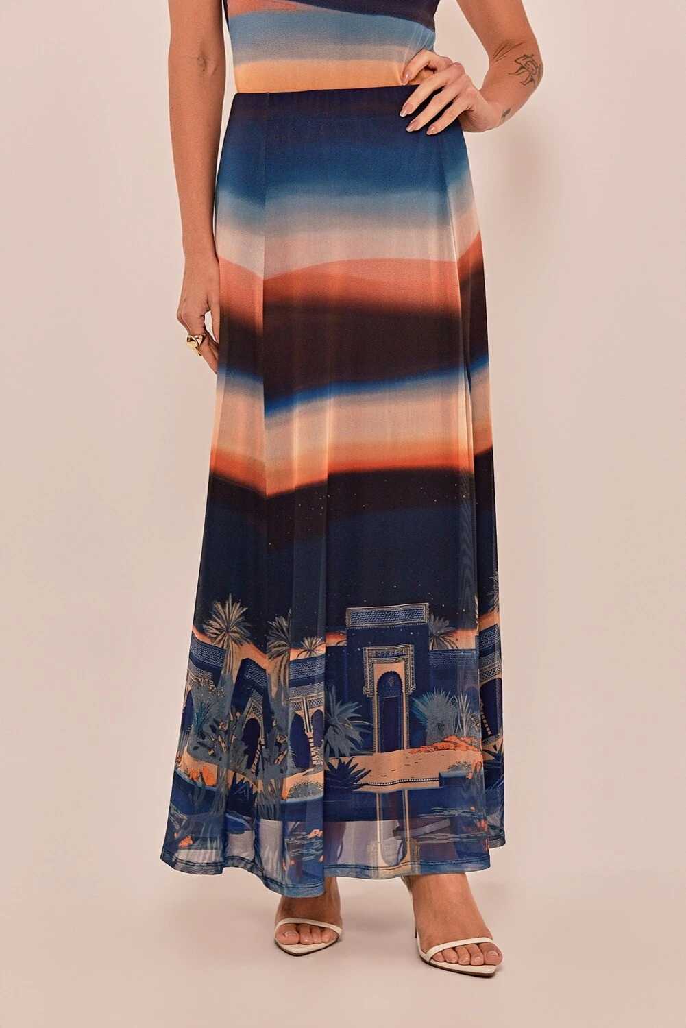 A saia Rebeca é confeccionada em tule com estampa localizada com arte autoral em cores vibrantes inspirada na noite de Marrakech. Possui modelagem reta, saia longa, cós aplicado em elástico, forro e barra simples.