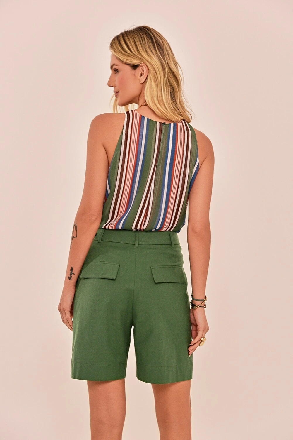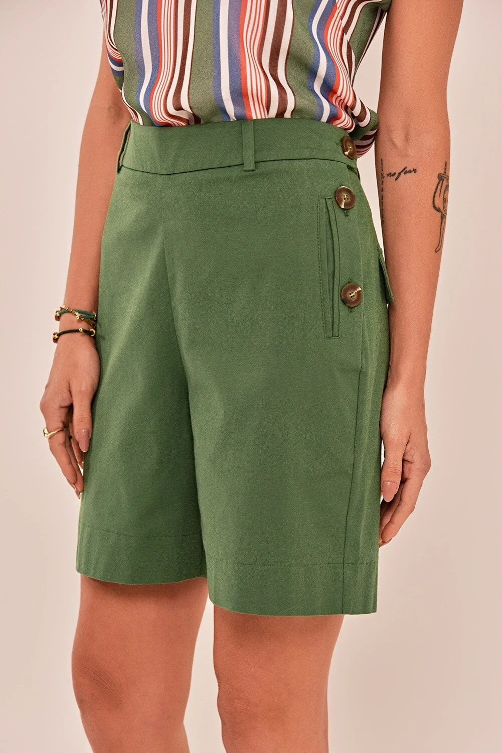 A bermuda Patrice é feita em tricoline paper touch, disponível na cor verde. Possui modelagem reta, cós aplicado com passantes em cintura alta, bolsos laterais e posteriores e botões decorativos aplicados na lateral da peça.