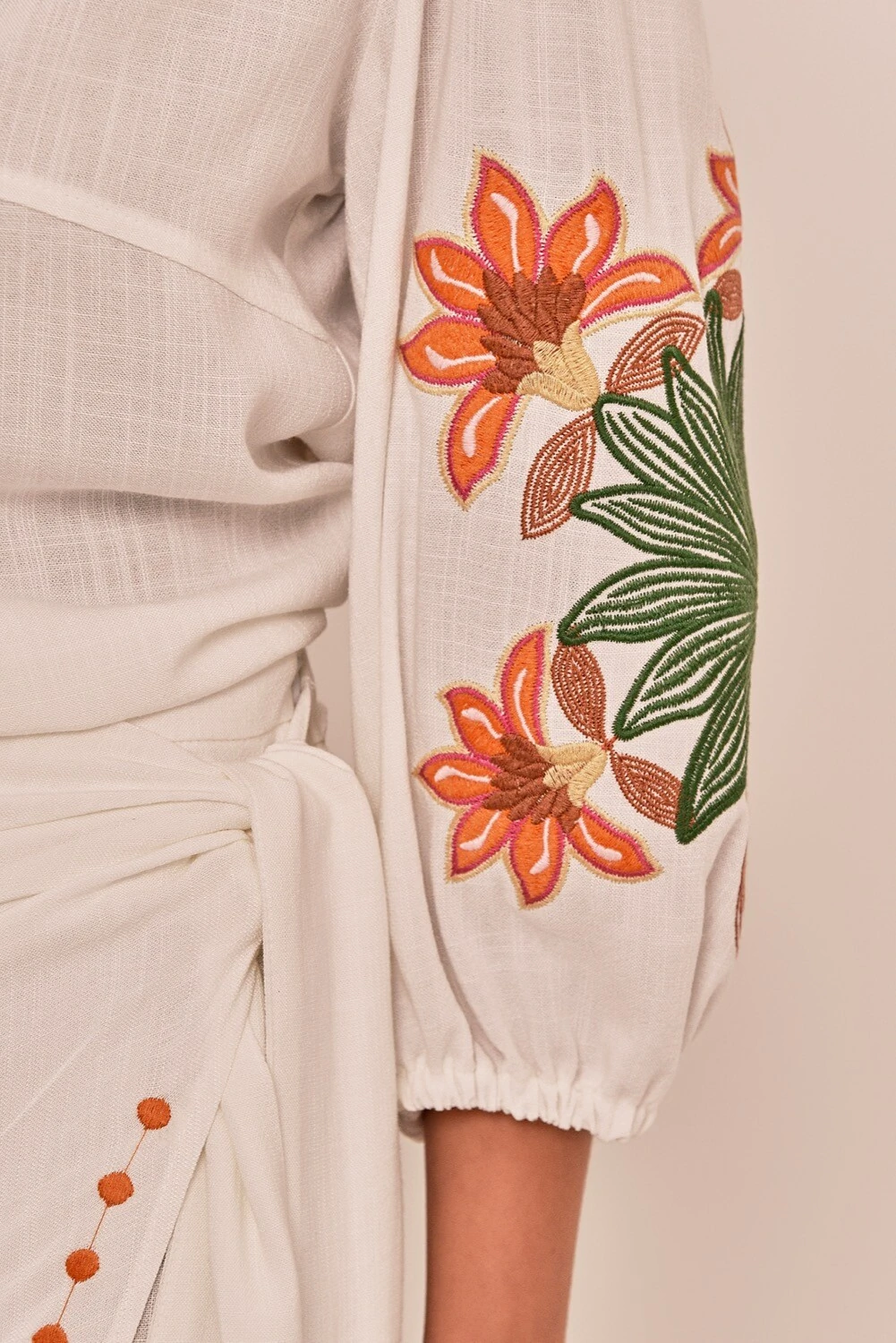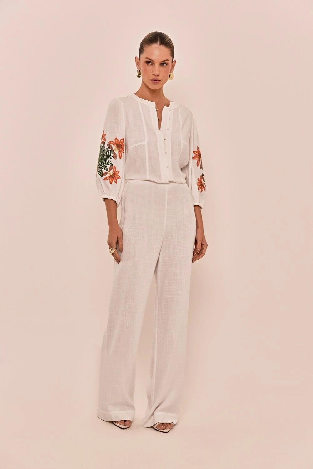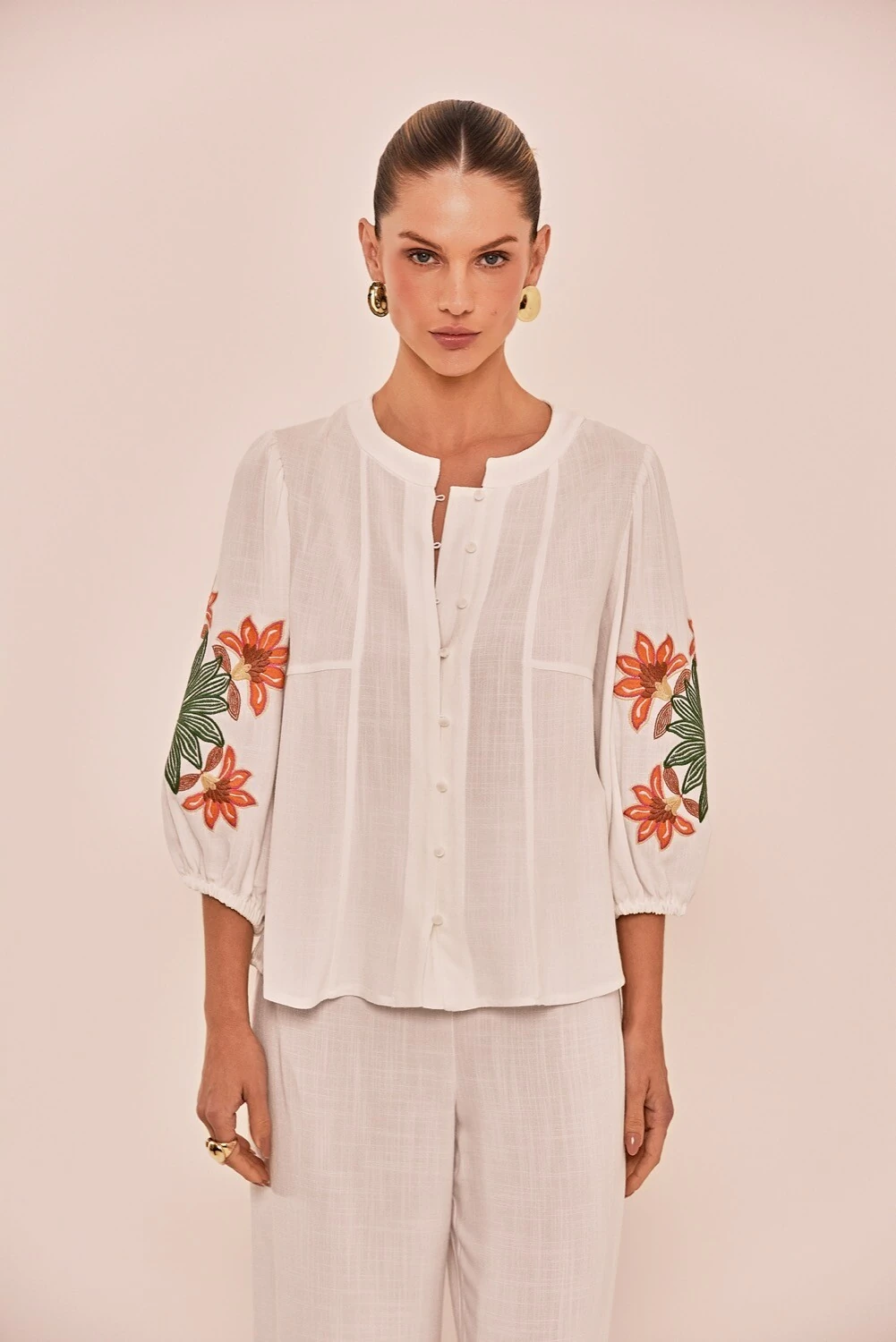 A blusa Miranda é feita em viscolinho com bordado, disponível na cor off-white. Possui modelagem slim, gola aplicada, manga 7/8 com punho ajustado, vista de botões e acabamento simples. Detalhes em bordados aplicados na manga.
