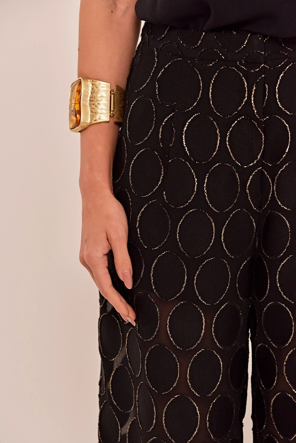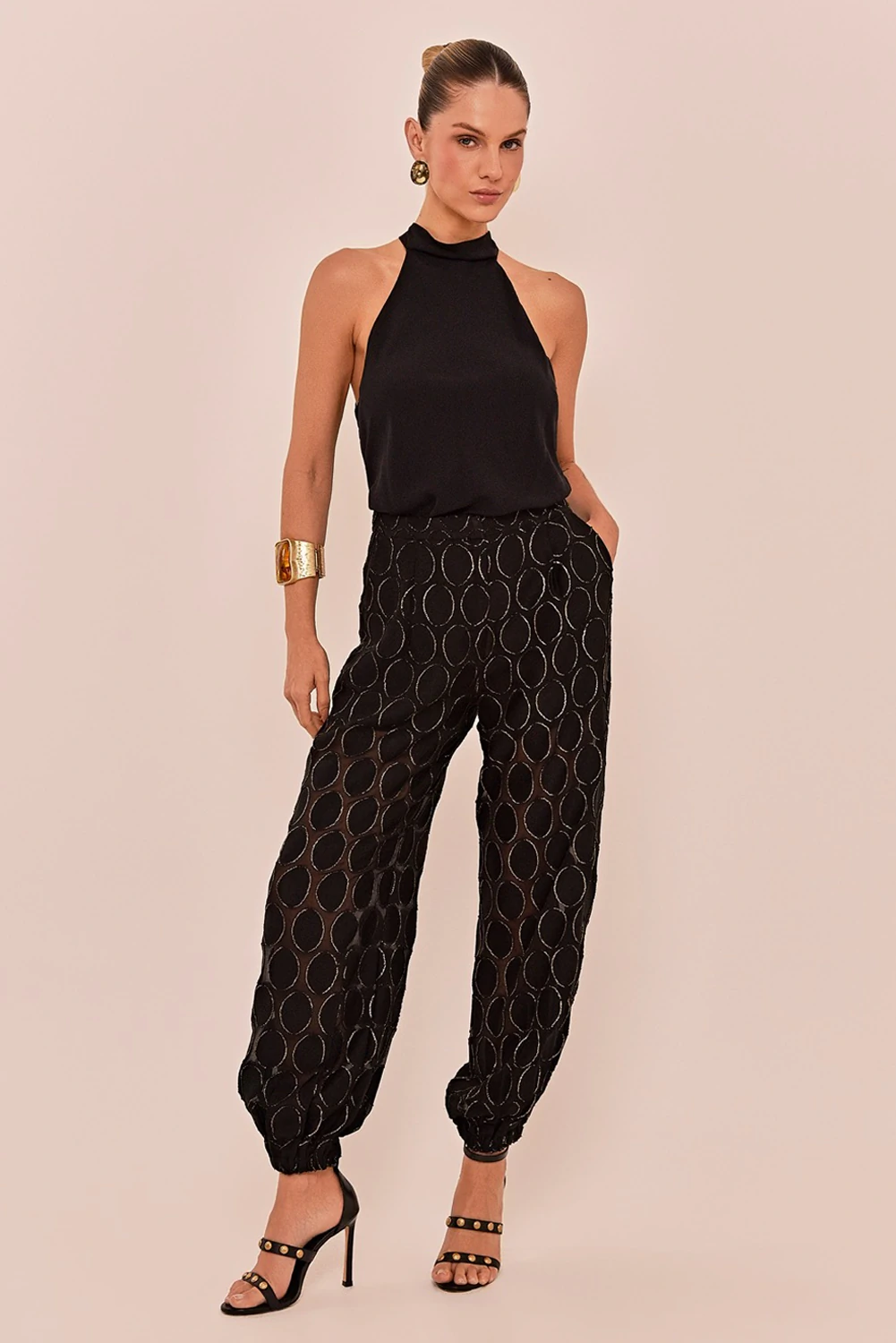 A calça Paula é feita em voil e lurex, disponível na cor preto com detalhes dourados. Modelo harem pants, modelagem ampla, cós aplicado. Possui leve transparência e acompanha shorts de forro em mesma cor para maior conforto.