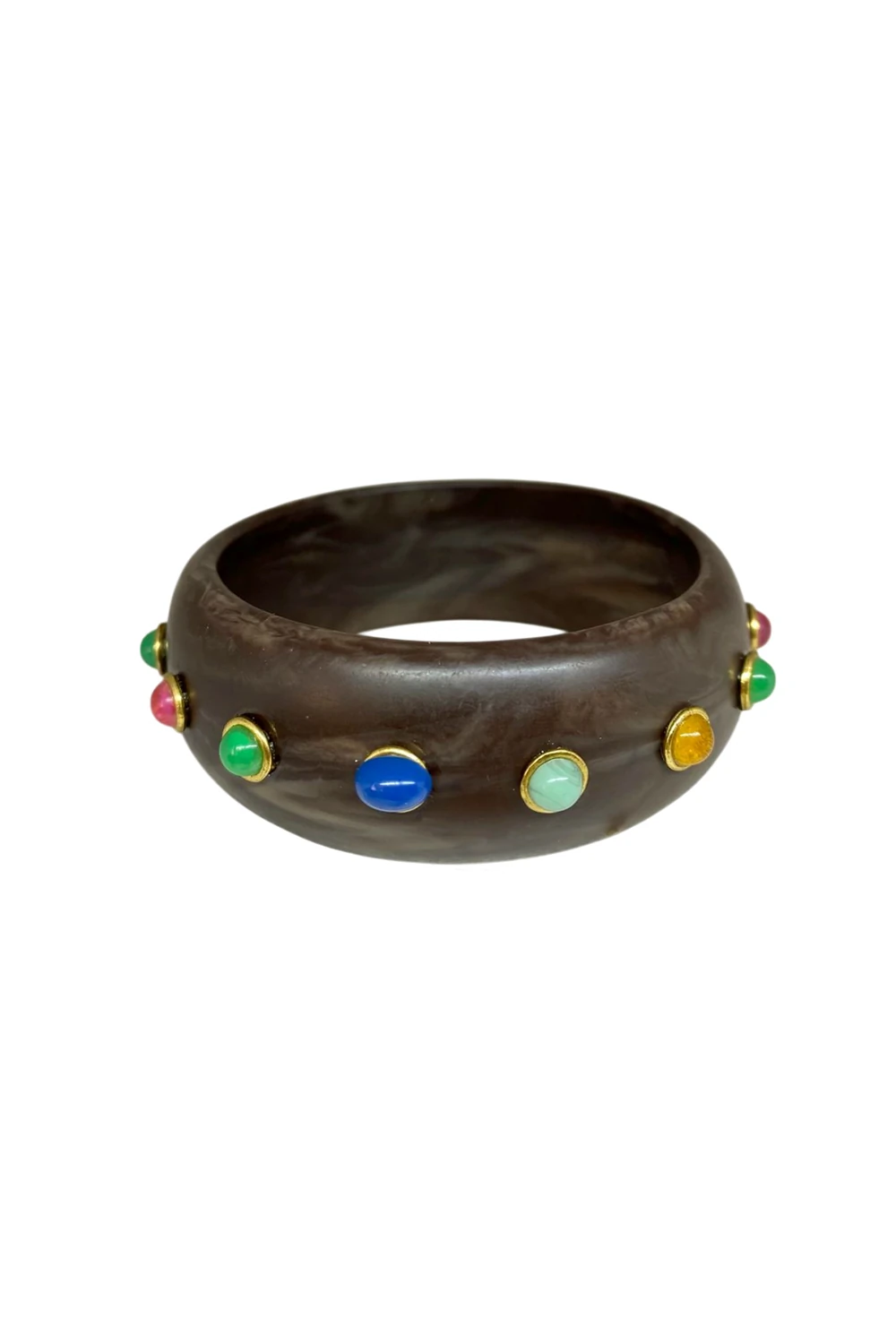 Essa Pulseira é o equilíbrio perfeito entre sofisticação e alegria. Em resina marrom com acabamento marmorizado, a peça ganha destaque com aplicações de pedras arredondadas em cores vibrantes, emolduradas por detalhes dourados que dão ainda mais charme ao design. Um acessório versátil que pode ser usado sozinho para um toque de cor ou combinado com outros itens da mesma família, criando composições modernas e cheias de estilo.