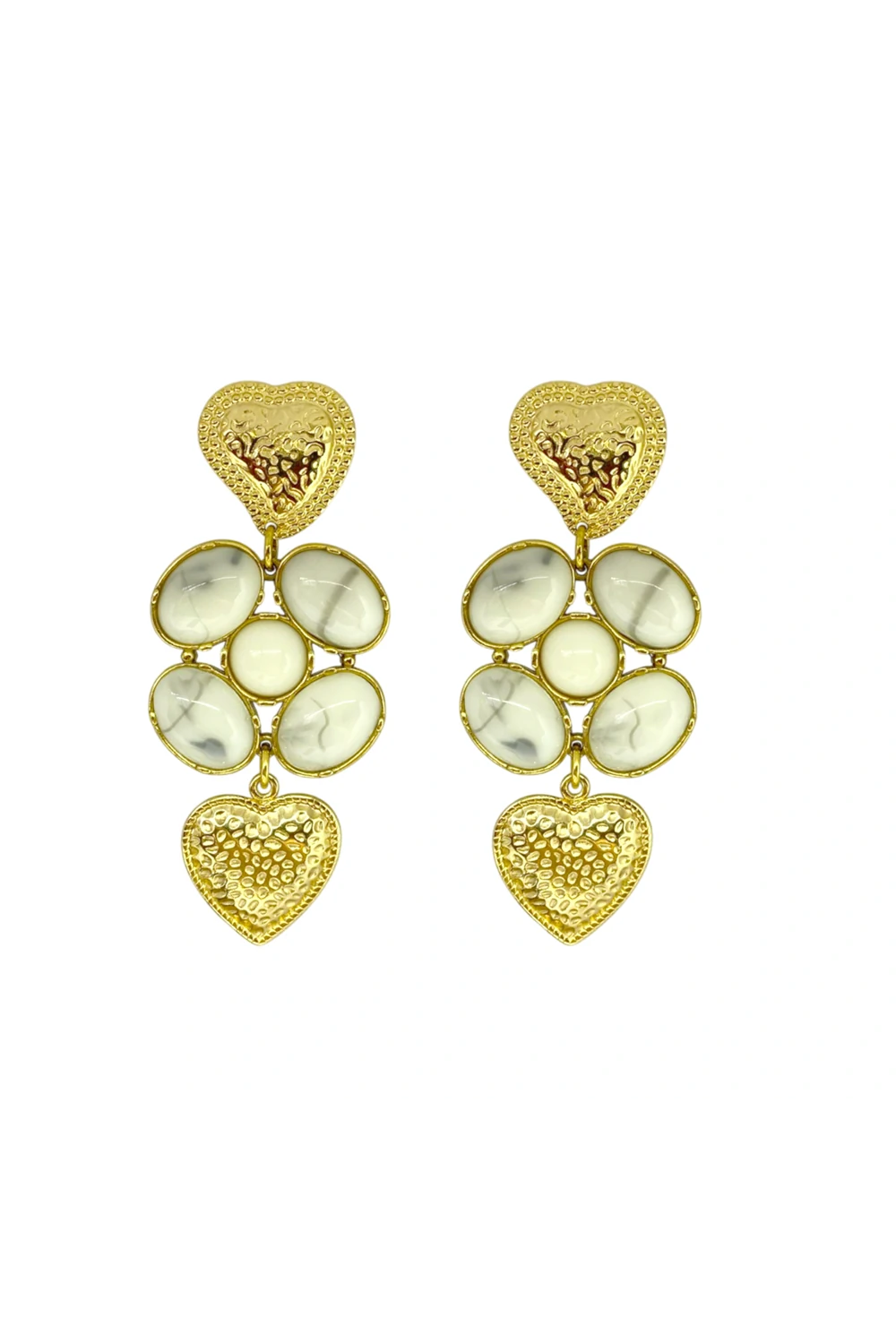 Com um design sofisticado e cheio de estilo, este brinco une o charme dos corações dourados texturizados ao brilho delicado das pedras ovais em tom claro. A combinação cria uma peça elegante, que ilumina o rosto e traz destaque imediato ao visual. Ideal para produções mais elaboradas, pode ser usado sozinho ou em conjunto com outras peças da mesma família, compondo um look harmonioso e sofisticado.