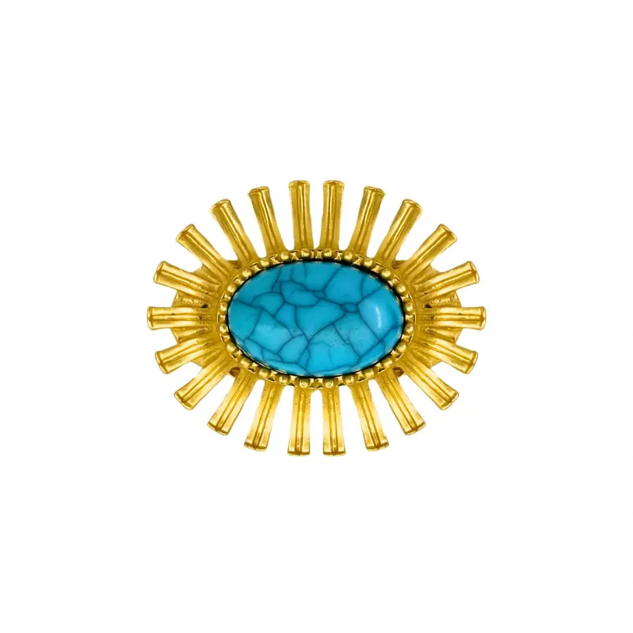 Broche raio oval fabricado em metal com banho dourado e resina oval na cor turquesa . Fechamento em imã!