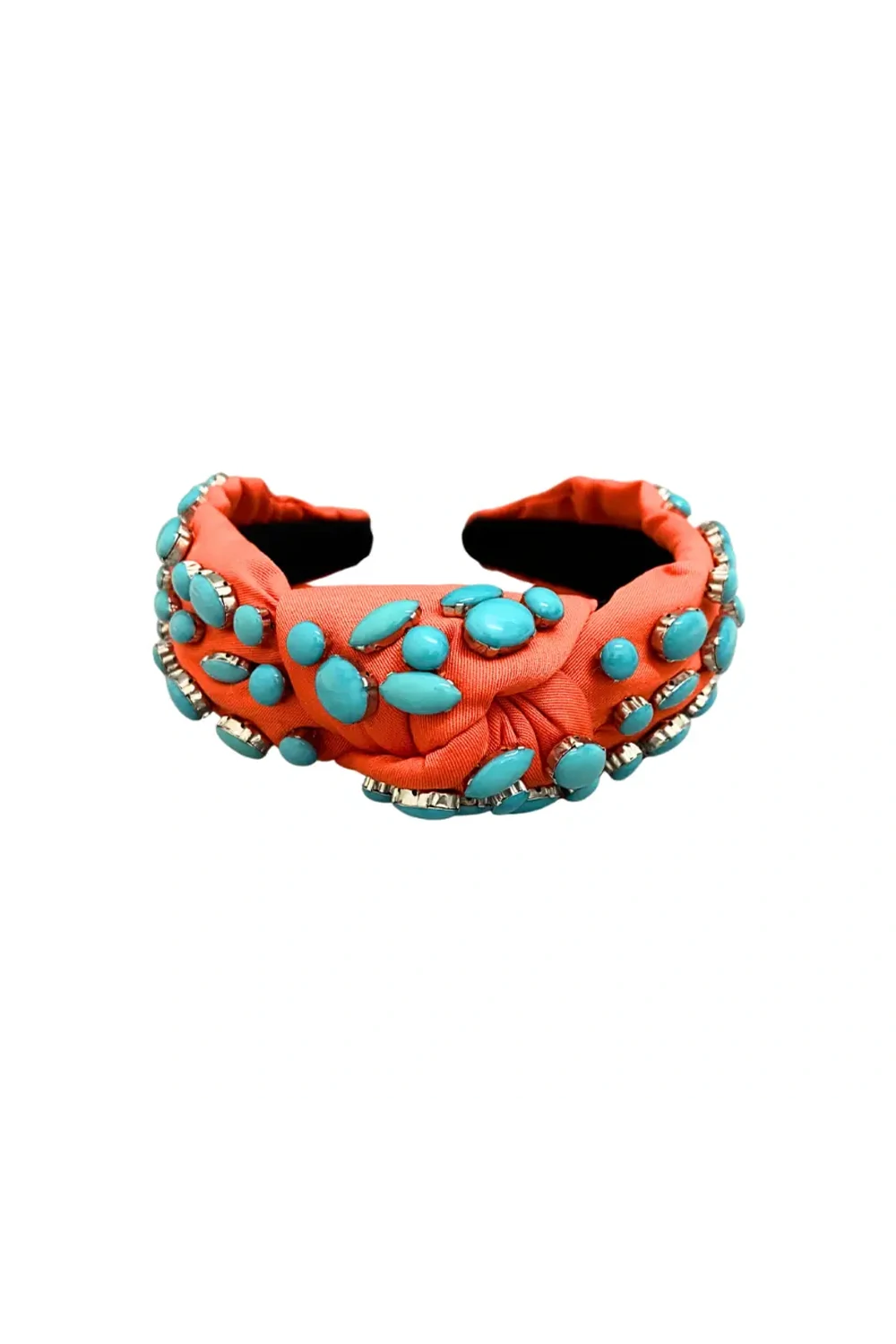 Tiara em acrilico resvestida por turbante de tecido na cor coral e bordada com resinas na cor turquesa