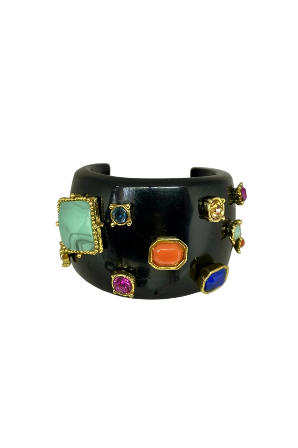 Bracelete rígido em resina preta com pedras multicoloridas em formatos variados e acabamento dourado. Um acessório ousado e cheio de estilo, ideal para dar destaque ao look.