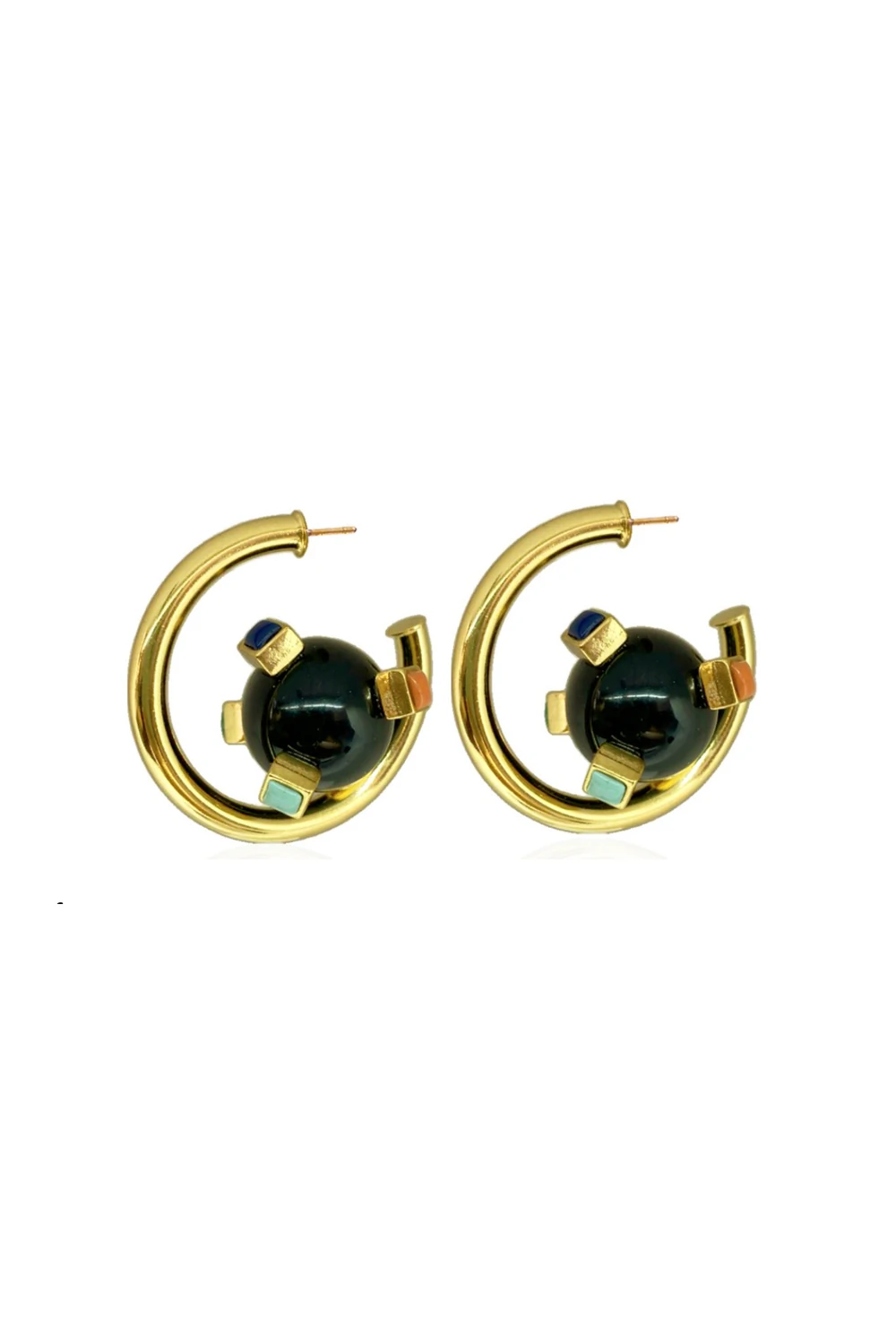 Este brinco em formato de argola moderna traz um design único e contemporâneo. Produzido em metal com banho dourado, possui uma esfera central em resina preta, adornada por delicados detalhes geométricos com pedras coloridas em tons suaves, que trazem frescor e autenticidade ao visual. Uma peça versátil, que pode ser usada tanto no dia a dia quanto em ocasiões especiais, garantindo estilo e sofisticação.
