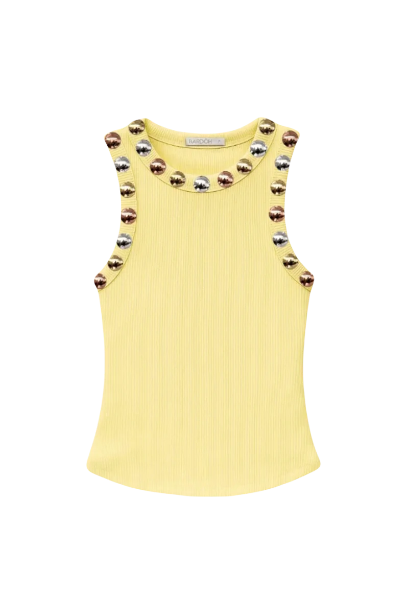 Regata em malha canelada com detalhes em tachas mix banhos (ouro, prata e rose).