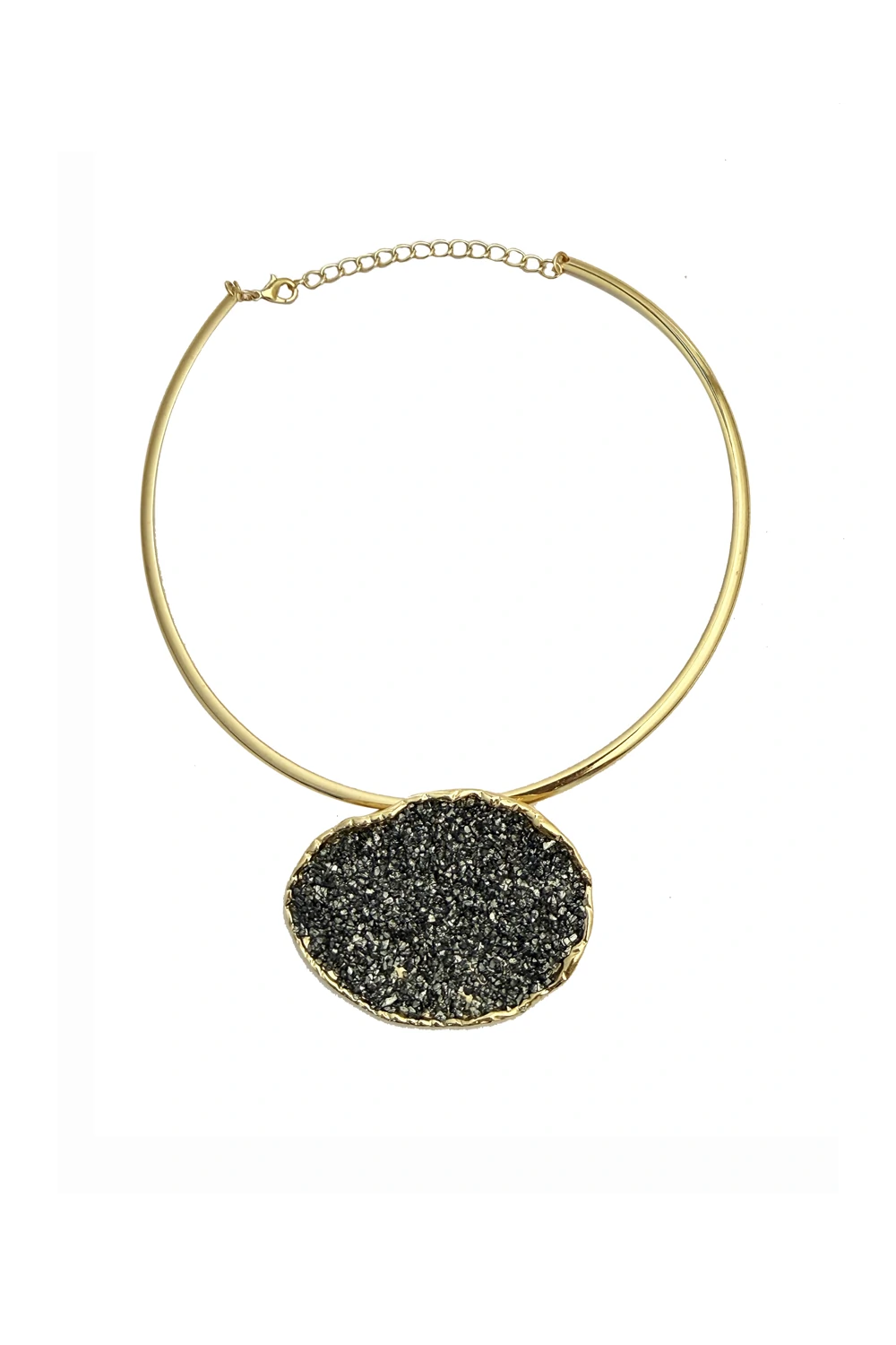 Colar aro metálico com banho dourado e pingente em druza de pirita. fechamento em corrente e fecho lagosta.