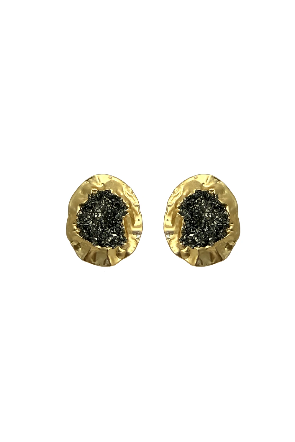 Brinco em druza de pirita com acabamento metálico fosco com banho dourado. Fechamento em pino e tarraxa.