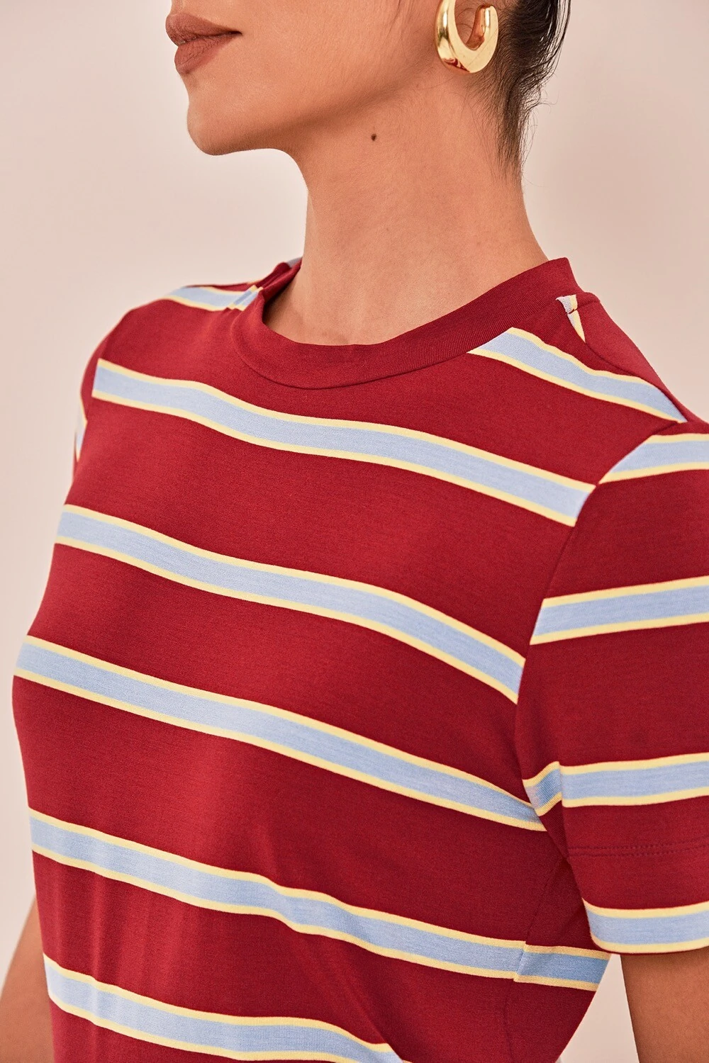 A camiseta Queenstown é feita em malha listrada, disponível na cor vermelho com listras azul e creme. Possui modelagem slim, mangas curtas, decote redondo e acabamento simples. Peça básica e confortável, essencial para o seu closet.