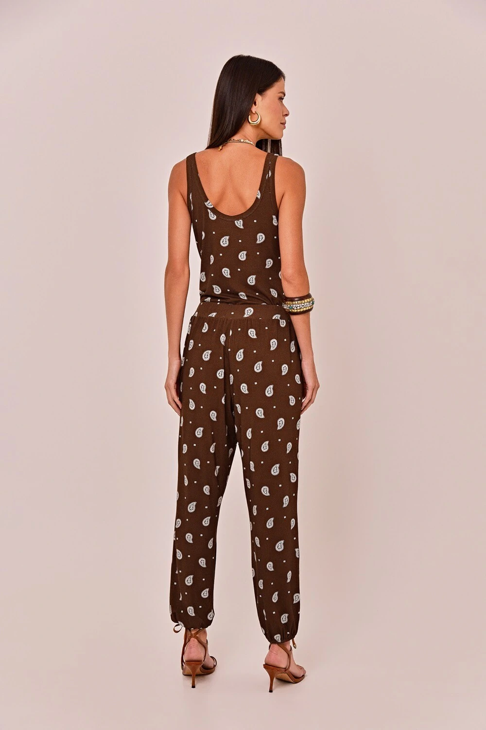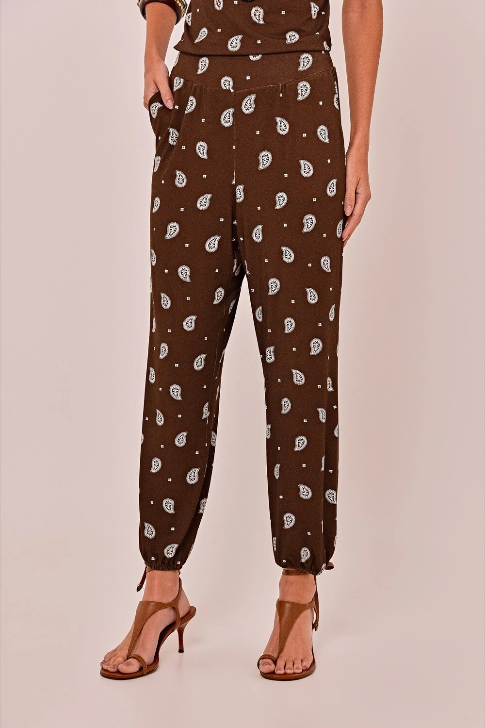 A calça Telma é feita em vicolycra com estampada paisley, disponível na cor marrom. Com modelagem aladdin, cós aplicado em cintura alta e acabamento simples. Detalhe por conta da aplicação de bordado manual com miçangas coloridas que compõem o desenho da estampa.