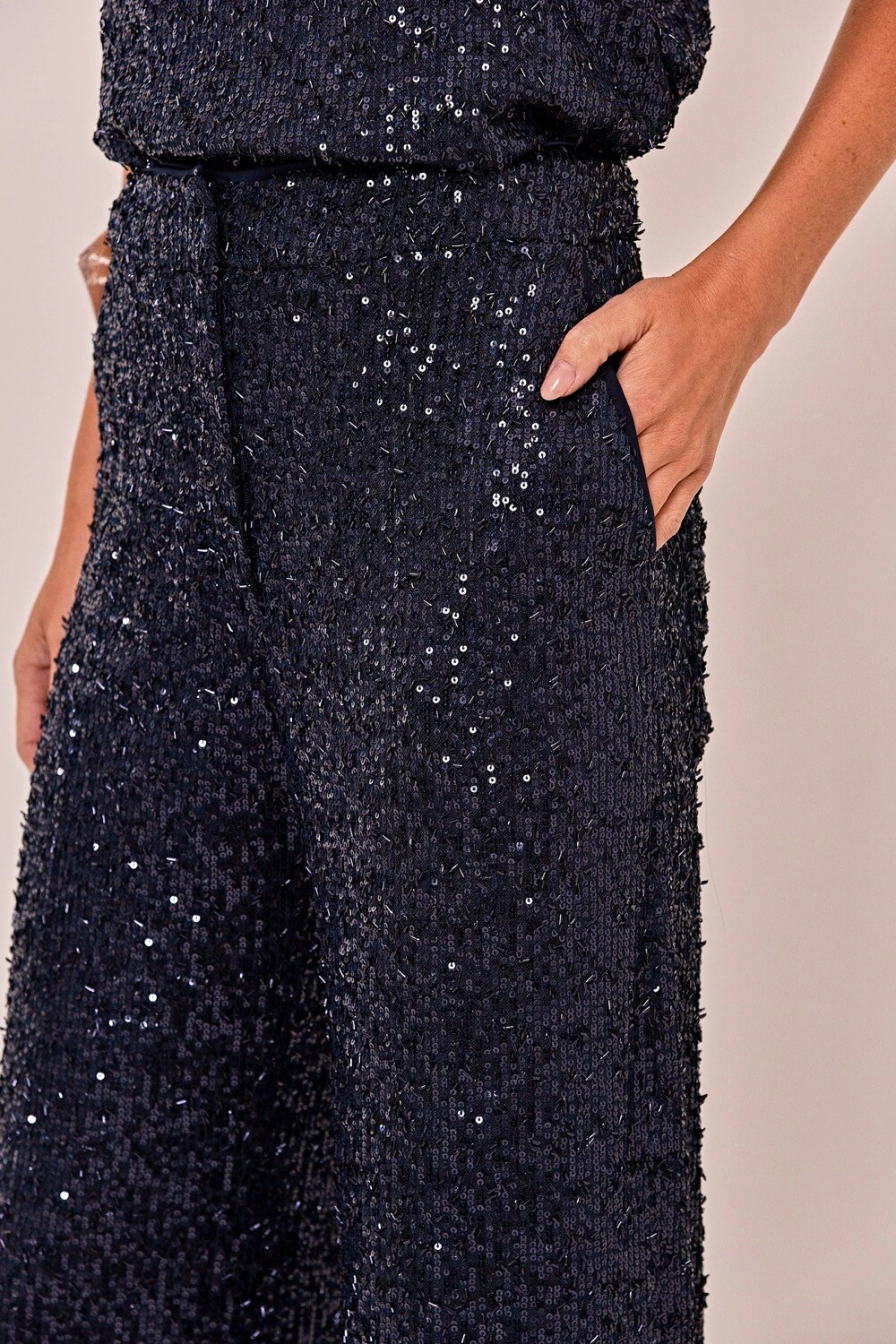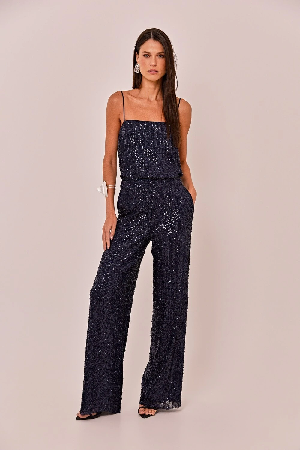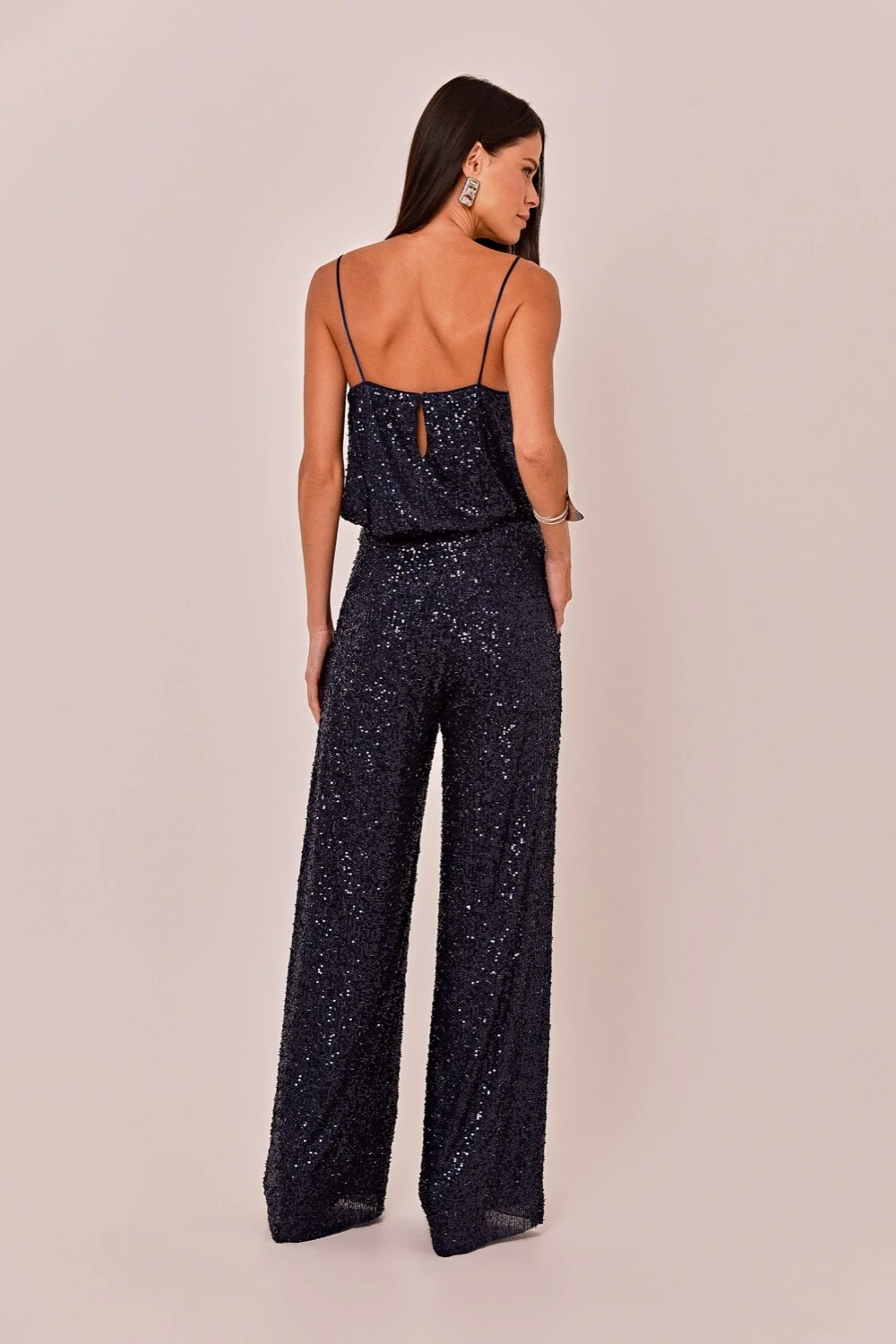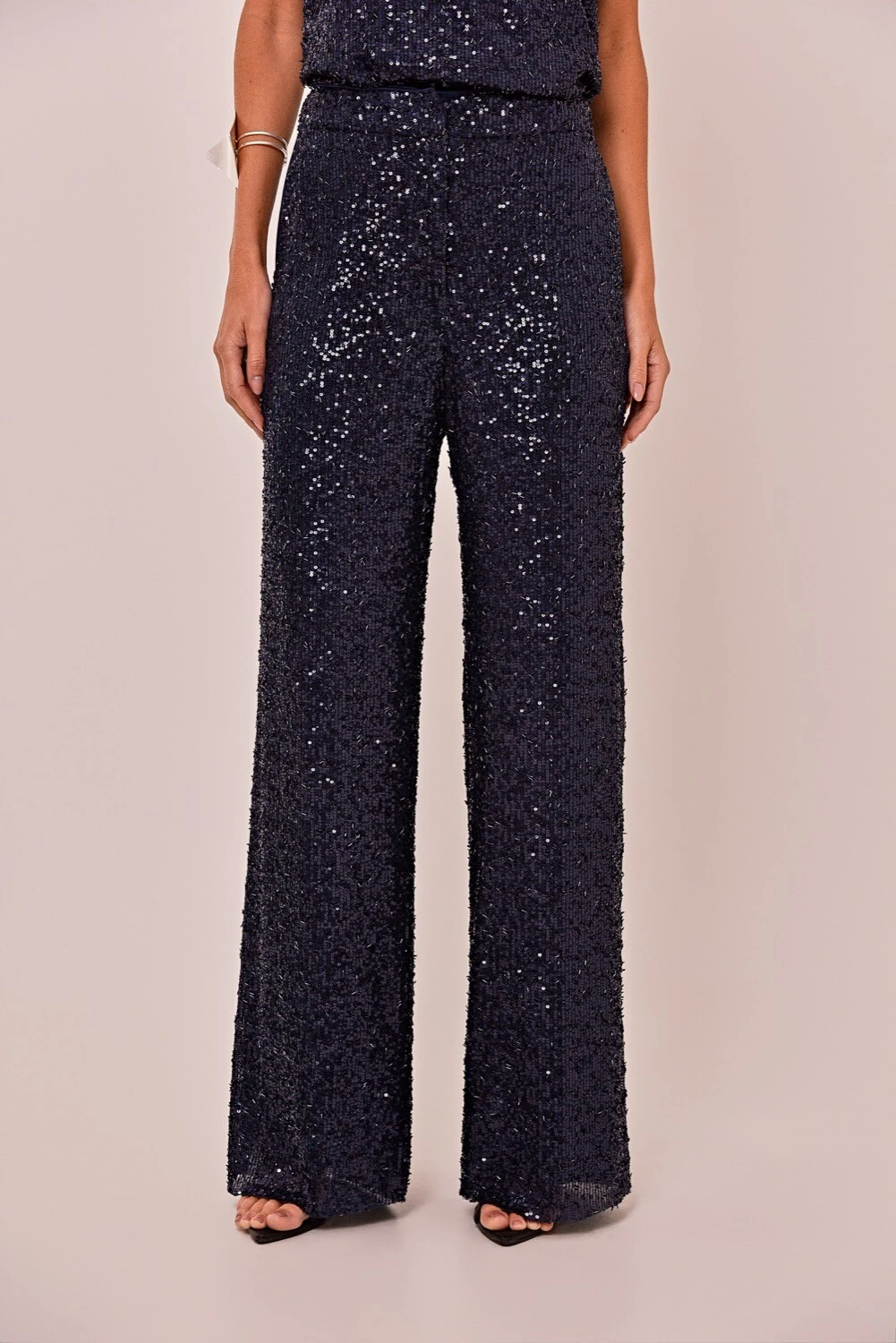 A calça Raquel é feita em paetê glam touch, disponível na cor azul marinho. Possui modelagem wide leg, cós aplicado em cintura alta, bolsos laterais e acabamento, paetês e canutilhos bordados no tecido, forro aplicado e acabamento em cetim. A peça esbanja elegância e sofisticação, ideal para um visual de impacto.
