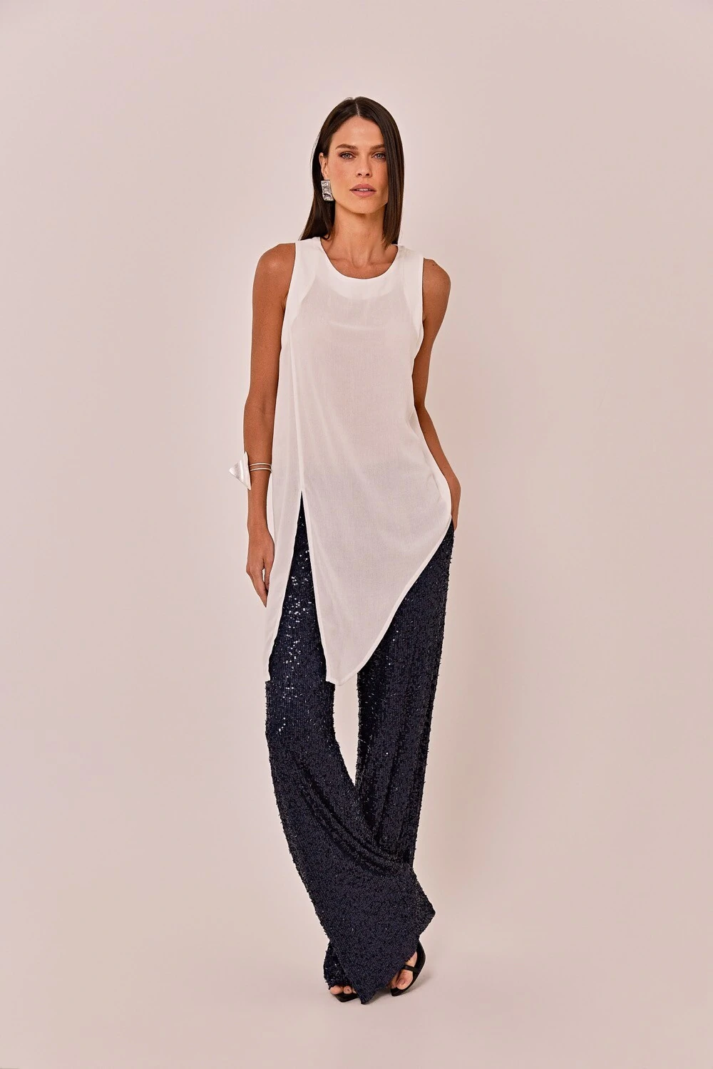 Use a calça Raquel com a blusa Rapsódia em mesmo tecido e cor, formando um look completo, matching set em paetê cheio de personalidade. Parte da coleção Casablanca, onde o clássico e o moderno se encontram em uma expressão de elegância e frescor.