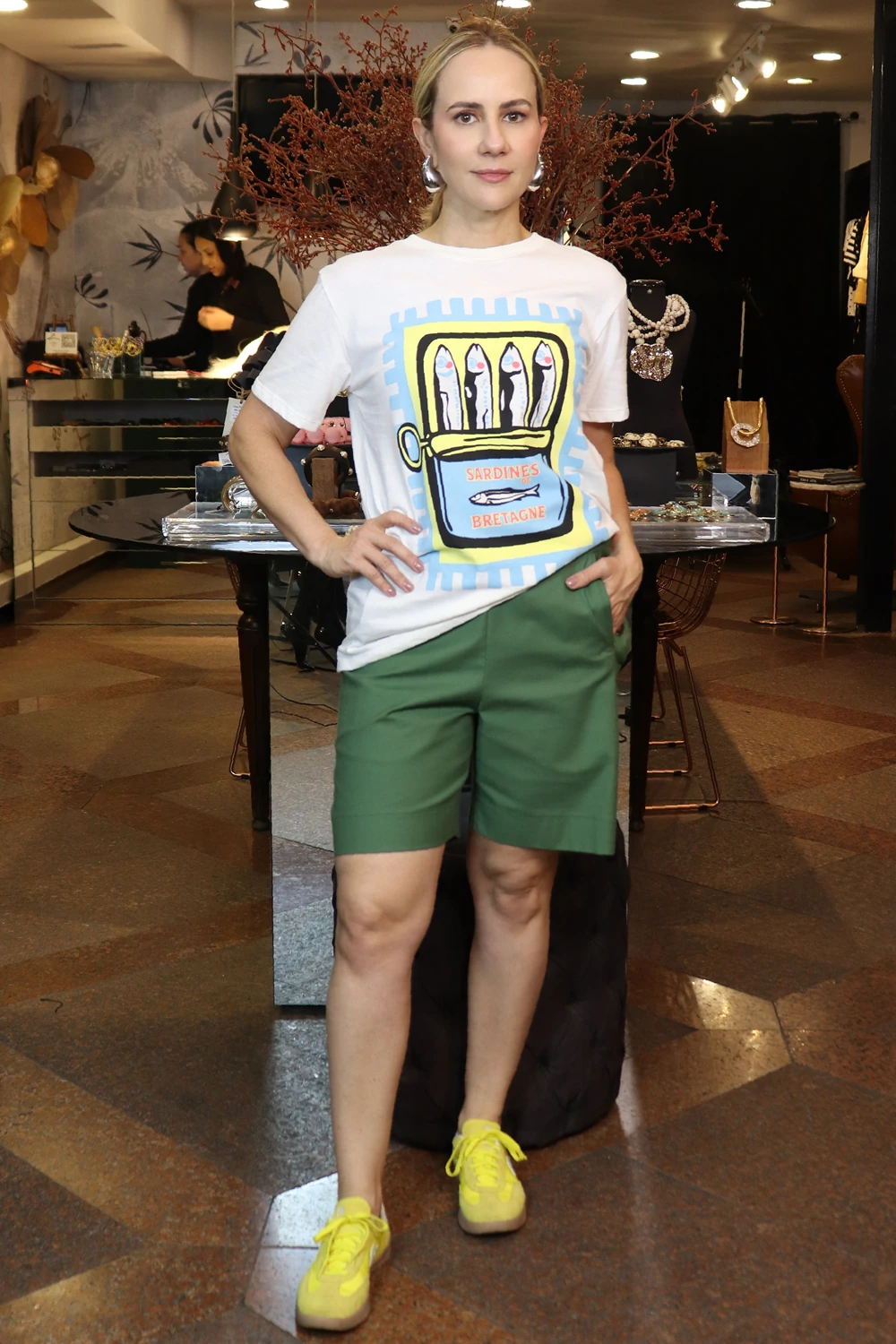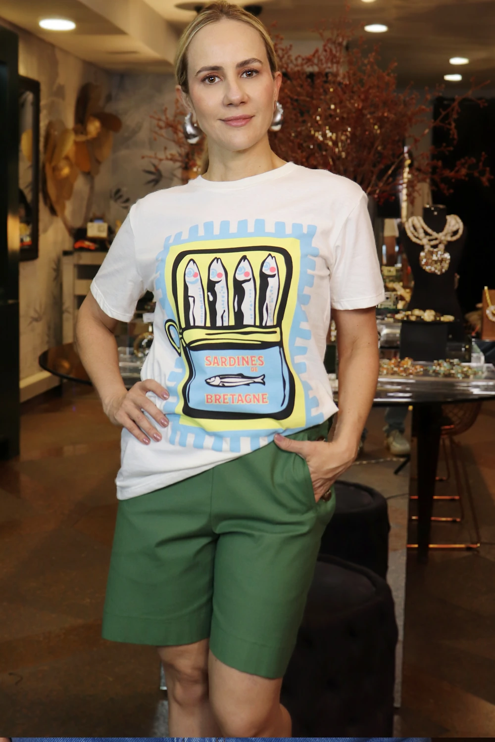 Camiseta confeccionada em algodão com estampa de sardinhas