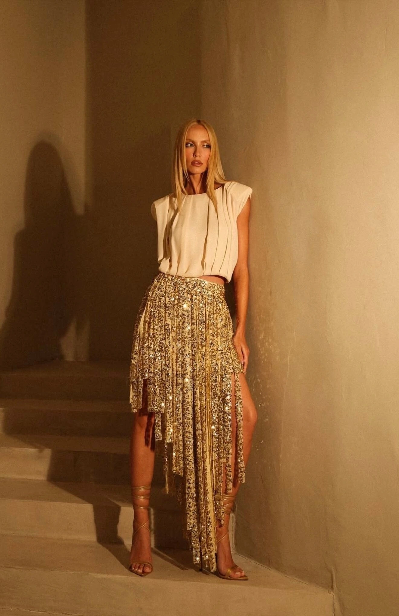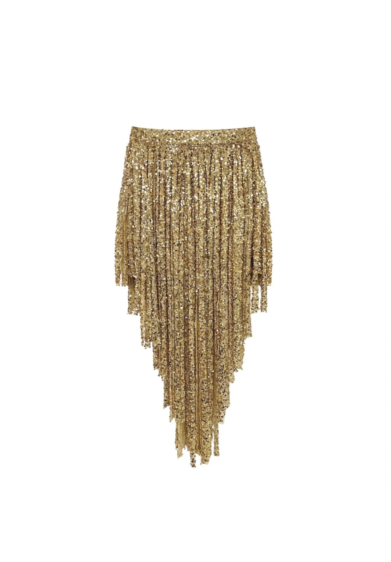Saia assimétrica confeccionada em paetês na cor dourada com tiras sobrepostas do mesmo tecido criando um movimento fluido e elegante que lembra franjas. Fechamento em ziper