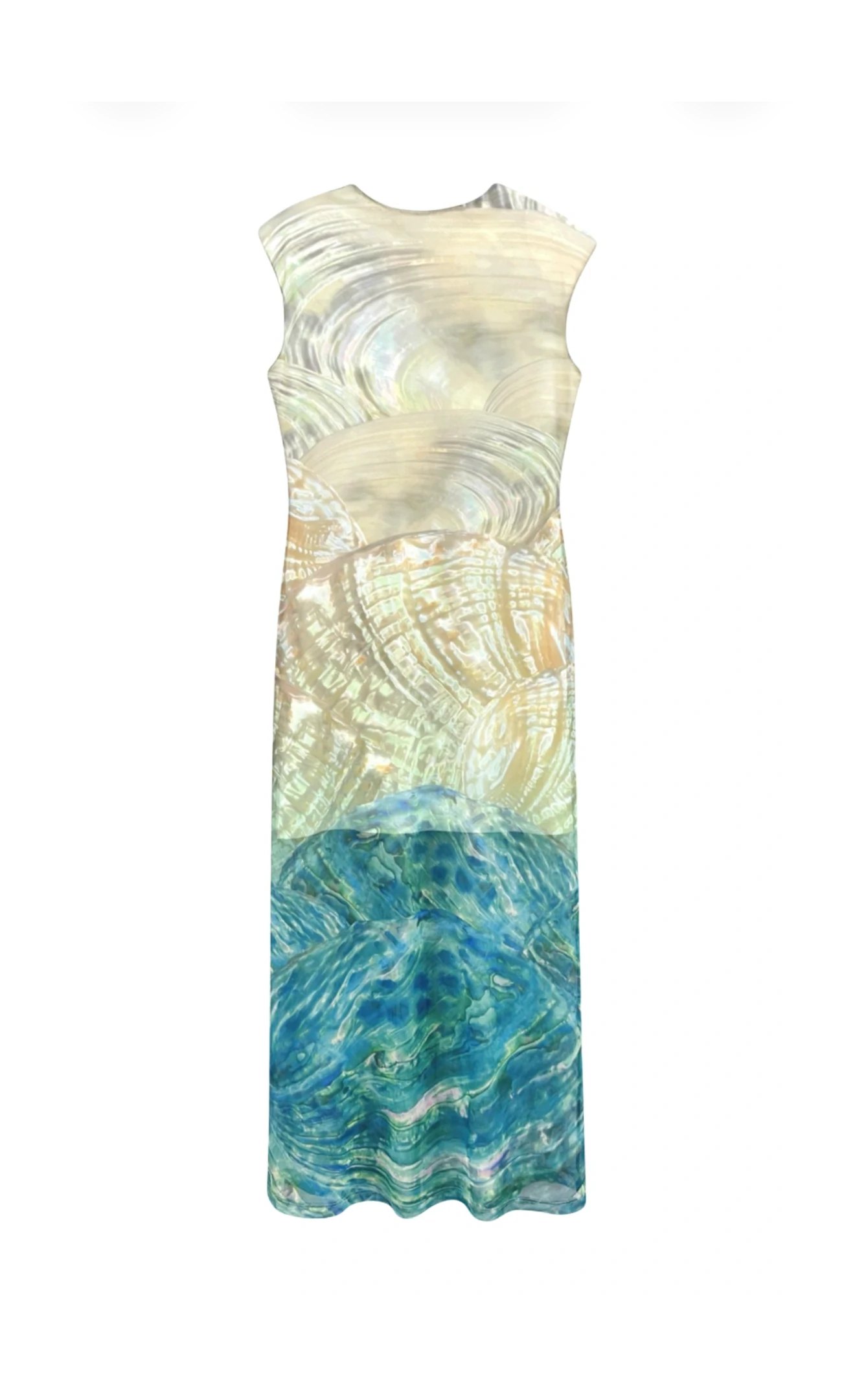 Vestido confeccionado em tule com estampa de abalone. Possui forro curto e ombreiras. Fechamento em ziper na parte posterior