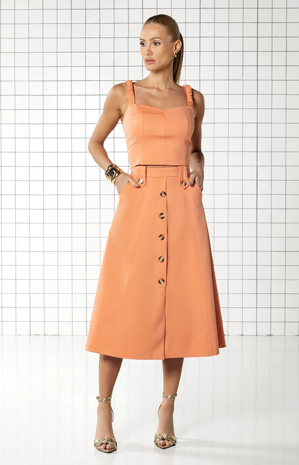 Saia midi confeccionada em alfaiataria premium. Possui modelagem godê com cintura alta e martingales embutidos no cós. 2 Bolsos frontais funcionais. Detalhe de fenda frontal com fechamento por botões. A vestibilidade é feita por meio de zíper posterior. Todos os aviamentos da peça foram exclusivamente desenvolvidos e personalizados Dress & Co.