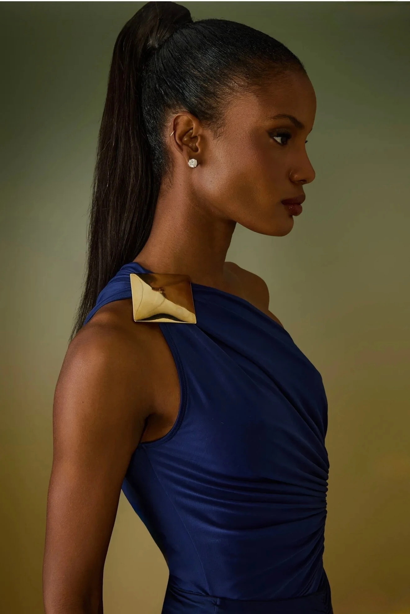 O design de um ombro só e a cor Navy o tornam elegante para ser usado tanto na praia quanto como body em um look casua