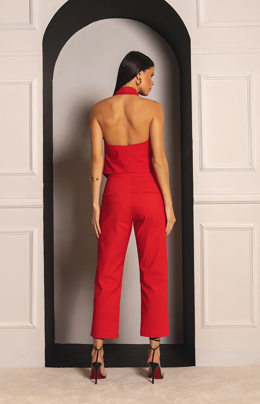 Calça confeccionada em alfaiataria premium. Possui modelagem reta com cintura alta e detalhes de bolsos não funcionais com botões. A vestibilidade é feita por meio de botão e zíper frontal. Todos os aviamentos da peça foram exclusivamente desenvolvidos e personalizados Dress & Co.