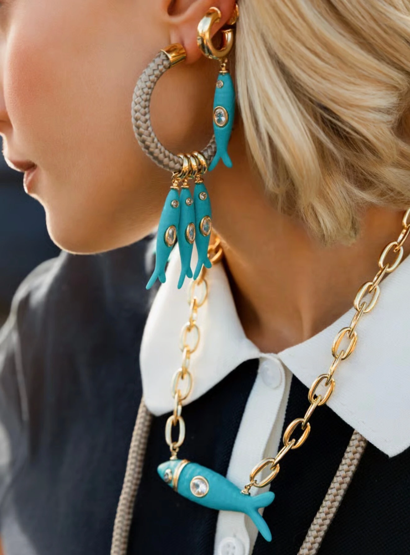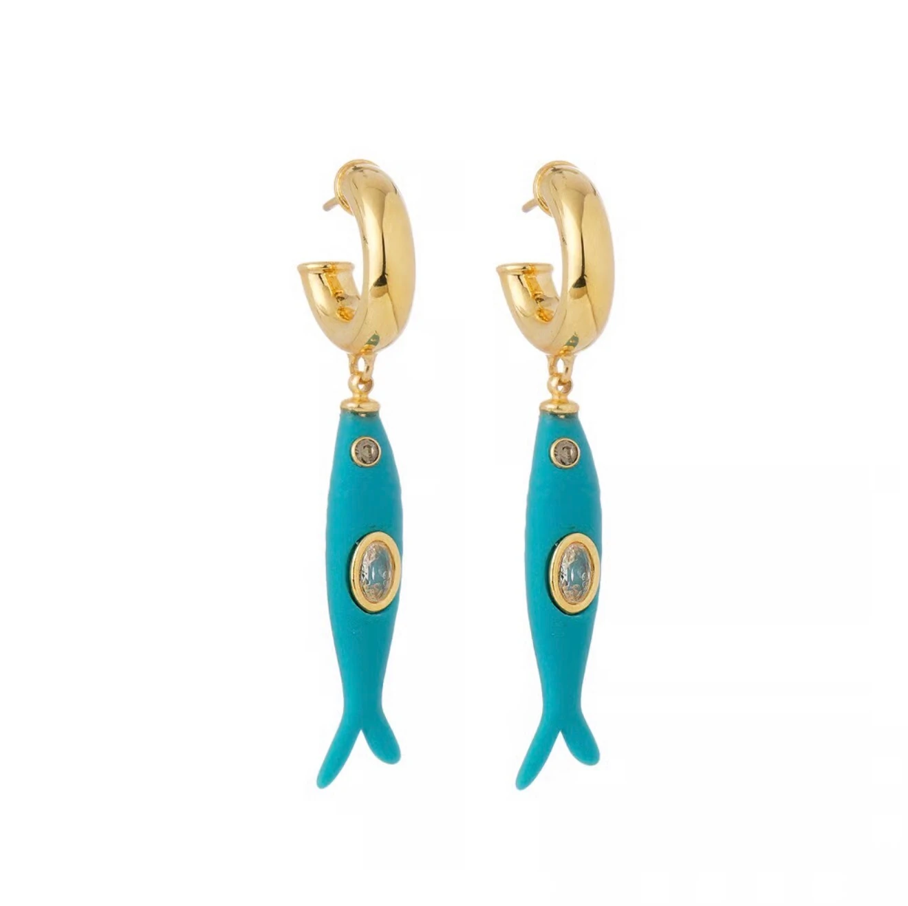 Clássico e moderno na mesma medida, o Brinco Argola de Pino Sardines traz o toque de irreverência e sofisticação característico da coleção WILD SARDINES: o mar está pra peixe. Produzido em metal com banho dourado, apresenta sardinha de resina com olhos em pedra de zircônia e aplicação de strass, garantindo brilho delicado e elegante.