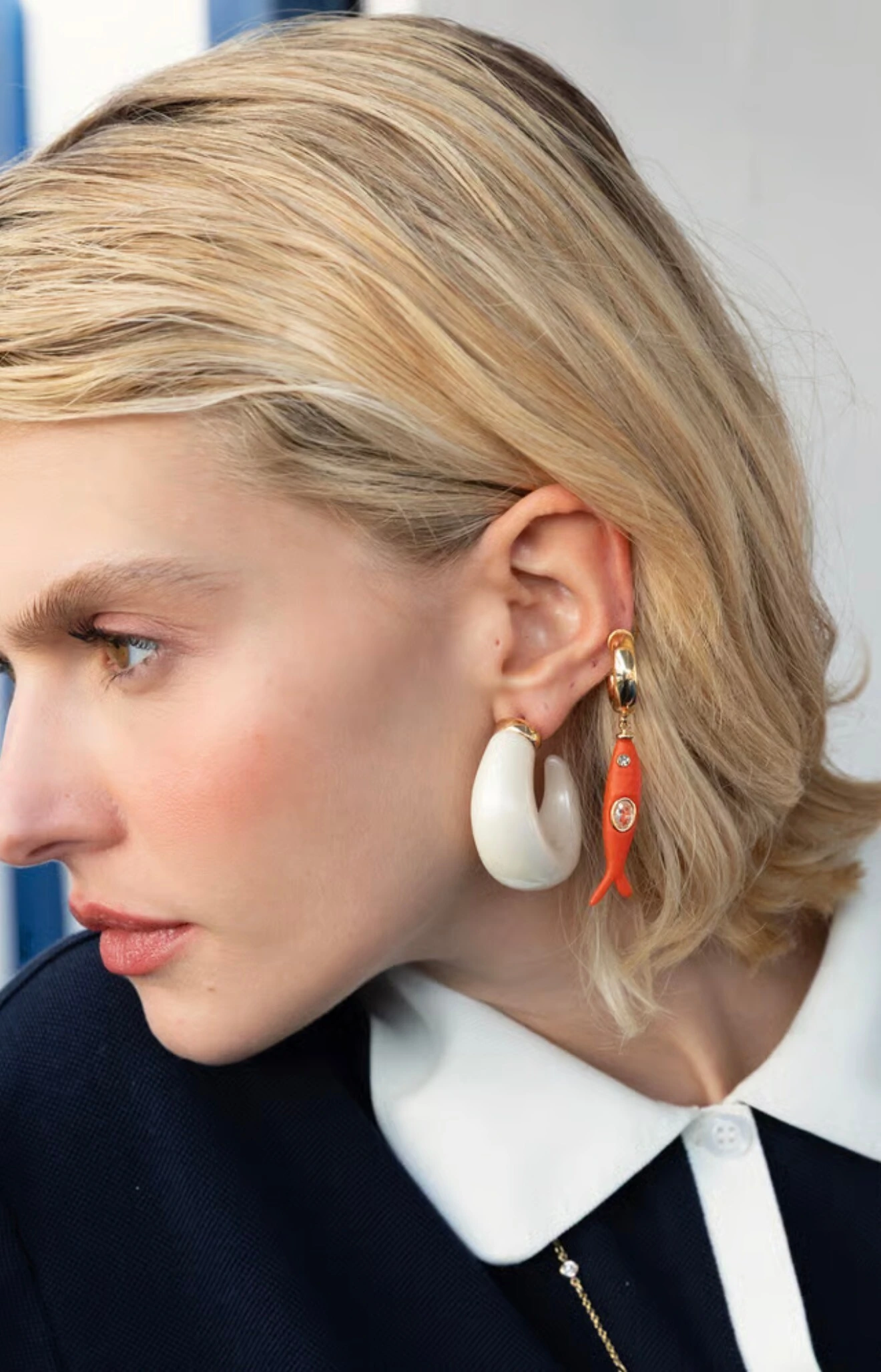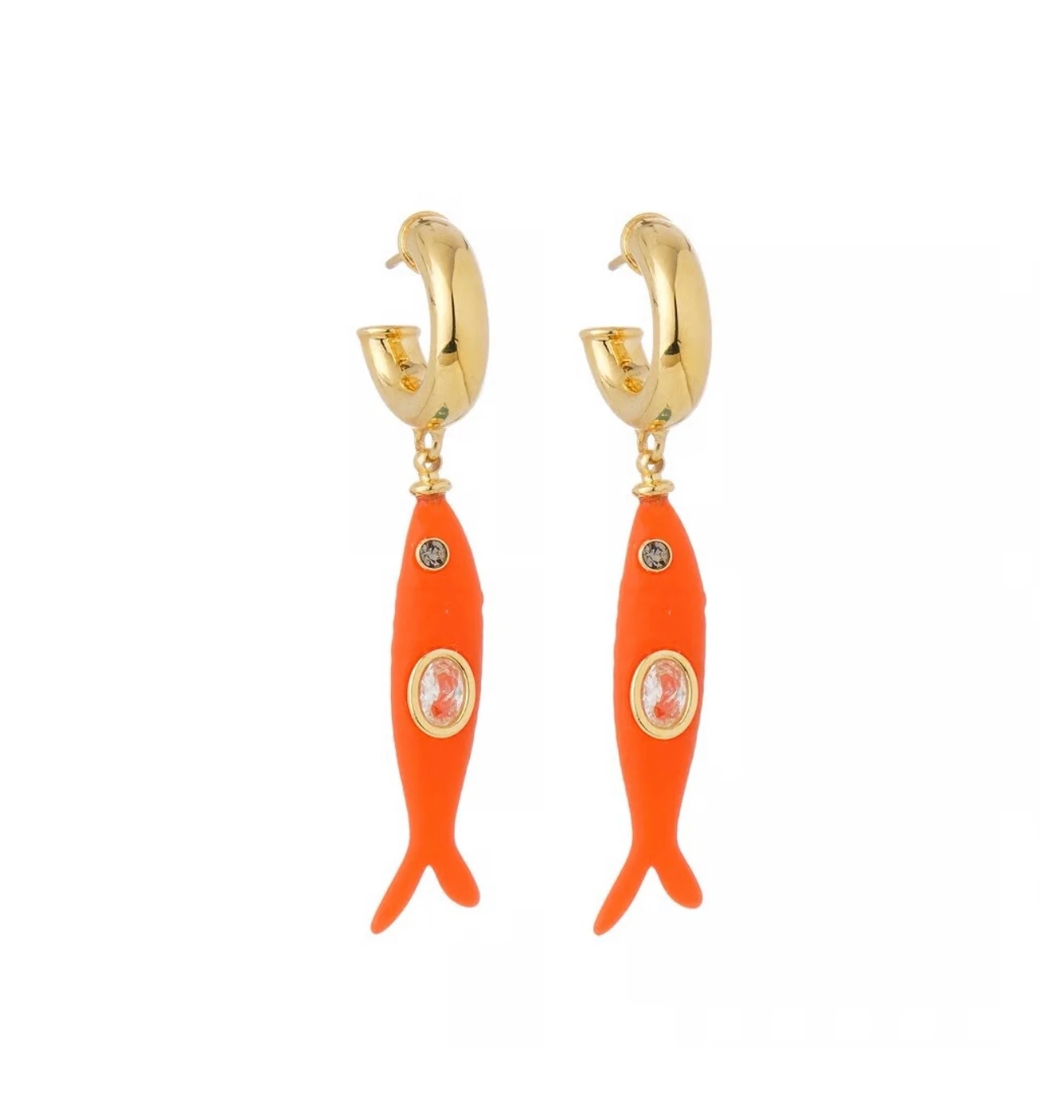 Clássico e moderno na mesma medida, o Brinco Argola de Pino Sardines traz o toque de irreverência e sofisticação característico da coleção WILD SARDINES: o mar está pra peixe. Produzido em metal com banho dourado, apresenta sardinha de resina com olhos em pedra de zircônia e aplicação de strass, garantindo brilho delicado e elegante.