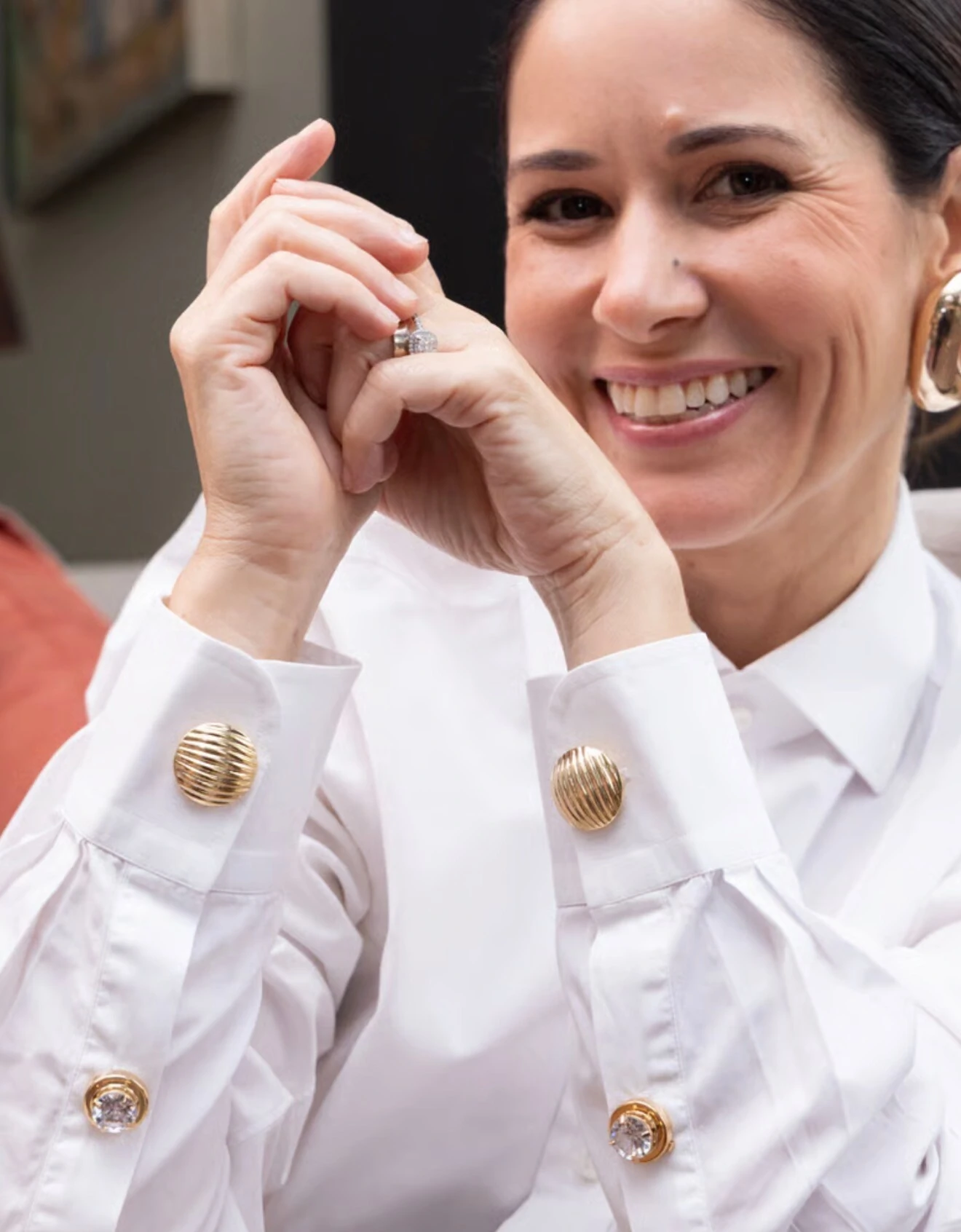 Dimensões: Zircônia de 1,2cm de diâmetro cravada em uma capa de botão de metal com banho dourado com 1,8cm de diâmetro e 0,4cm de altura