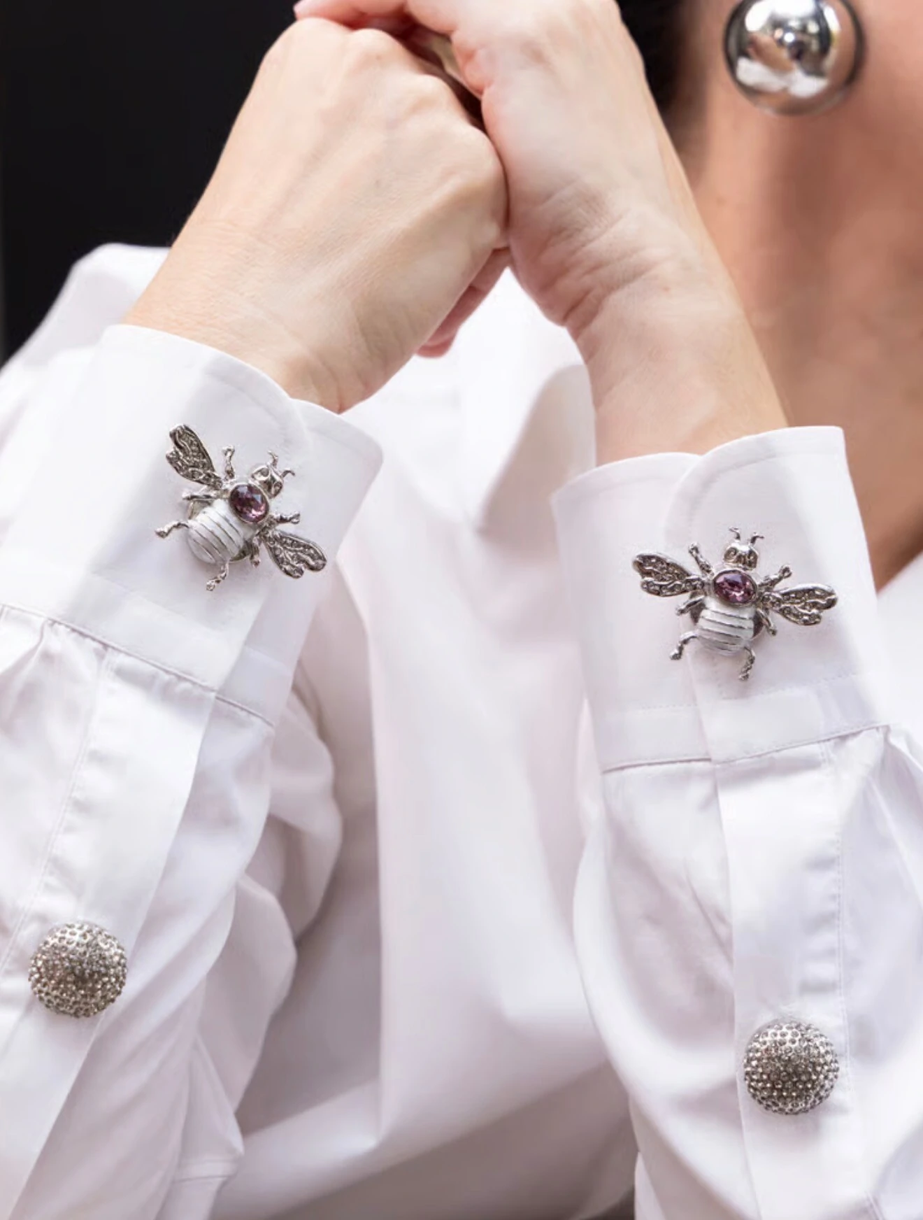 Um toque lúdico com brilho sofisticado. A Capa para Botão Abelha é uma peça statement que une delicadeza e personalidade. Fundida em metal com banho prata, a abelha mede 4,3 cm entre as pontas das asas e 3,4 cm da ponta das antenas até os pés, com 0,8 cm de altura. O corpo é adornado com um cristal austríaco oval na cor Antique Pink (6x8 mm), enquanto os olhos e as asas recebem aplicação de strass para um brilho sutil e elegante. Ideal para personalizar camisas com estilo autoral e um toque de originalidade.