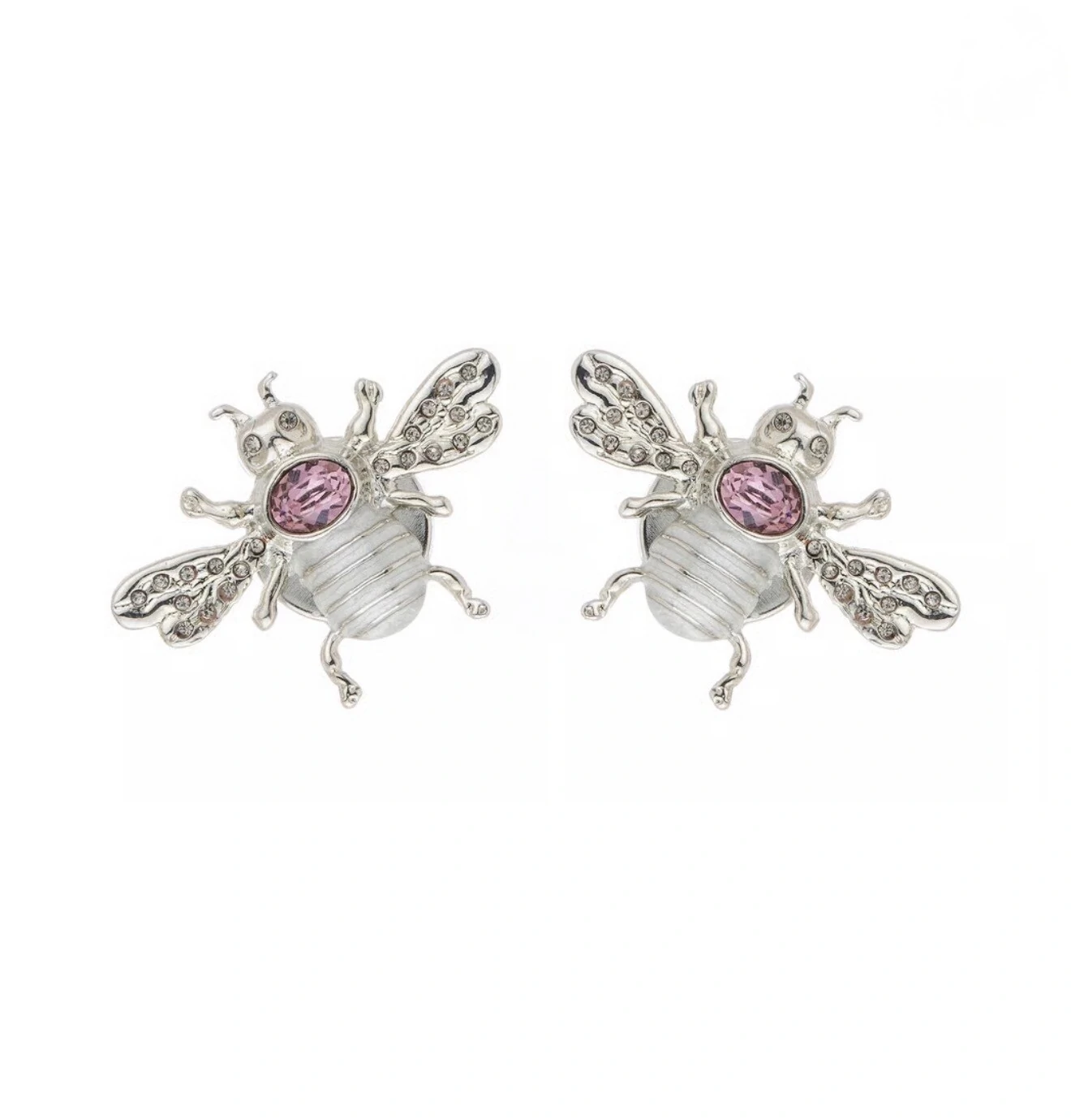 Dimensões: Abelha de metal com banho prata, medindo 4,3cm entre as pontas das asas e 3,4cm das pontas das antenas até os pés com 0,8cm de altura. Strass aplicado nos olhos e nas asas e um cristal austríaco de 6x8 na cor Antique Pink