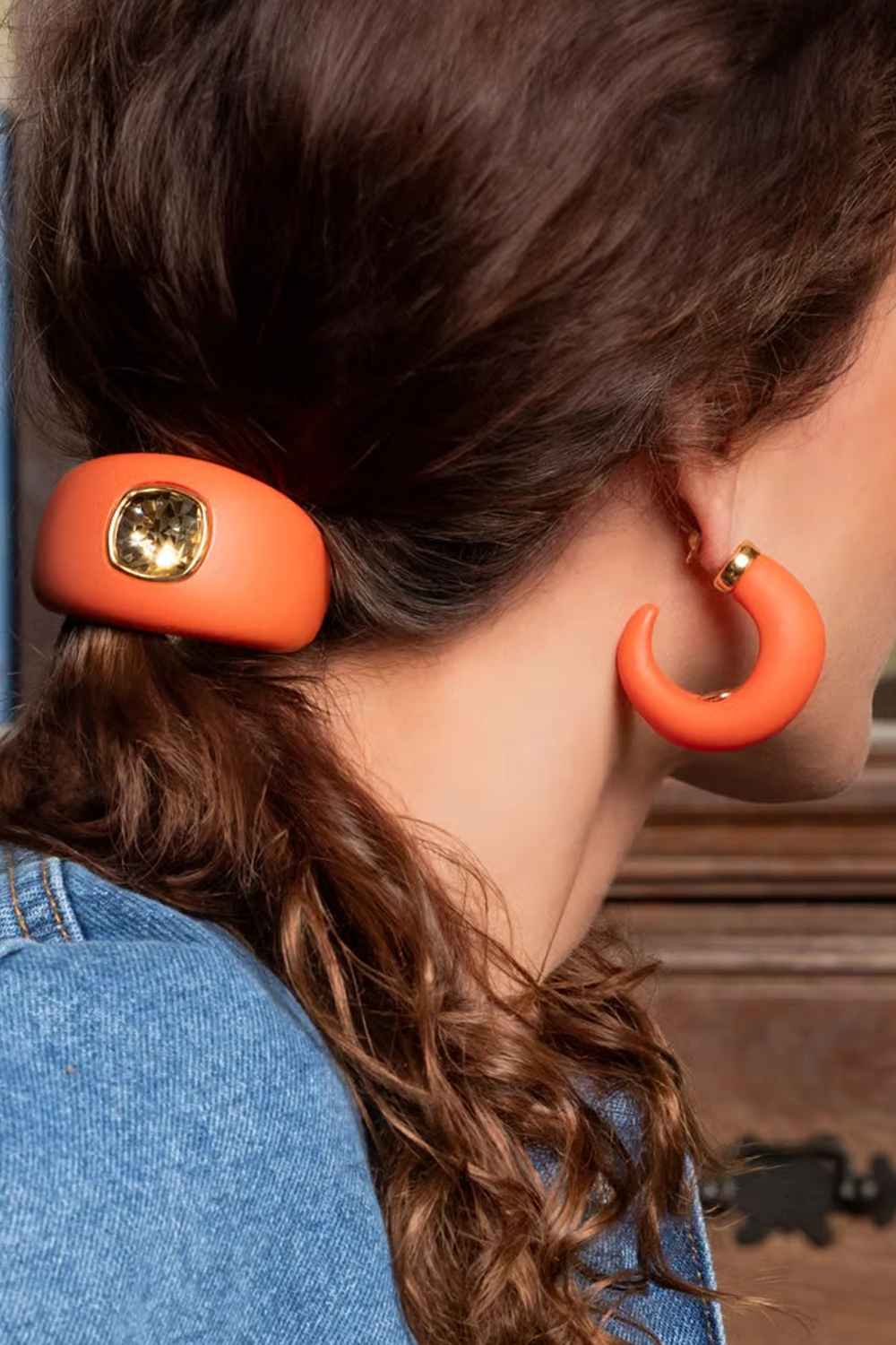 O Brinco Meia Argola Pigmento é uma peça leve, moderna e cheia de personalidade. Com 4 cm de comprimento, seu design arredondado em resina traz um visual marcante com acabamento liso e fosco sutil.