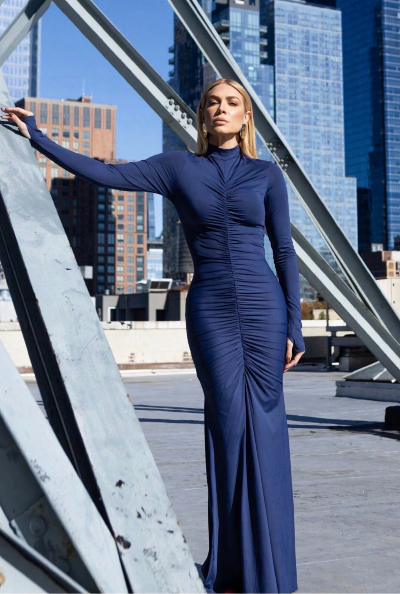 Vestido longo drapeado com manga longa confeccionado em jersey