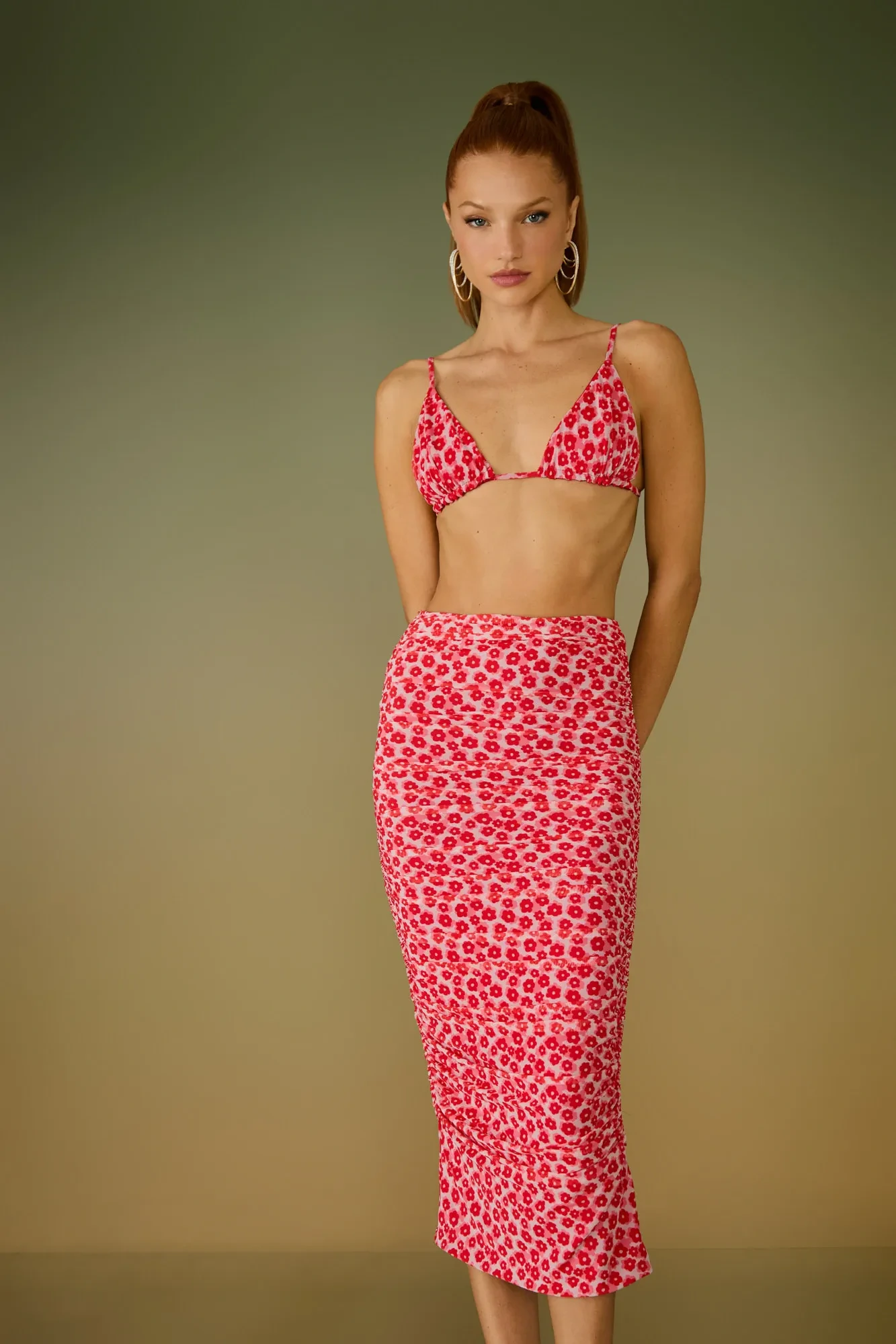 Saia midi confeccionada em tule estampado. Modelagem ajustada ao corpo, com cintura alta e drapeado nas laterais, Fechamento em zíper invisível nas costas