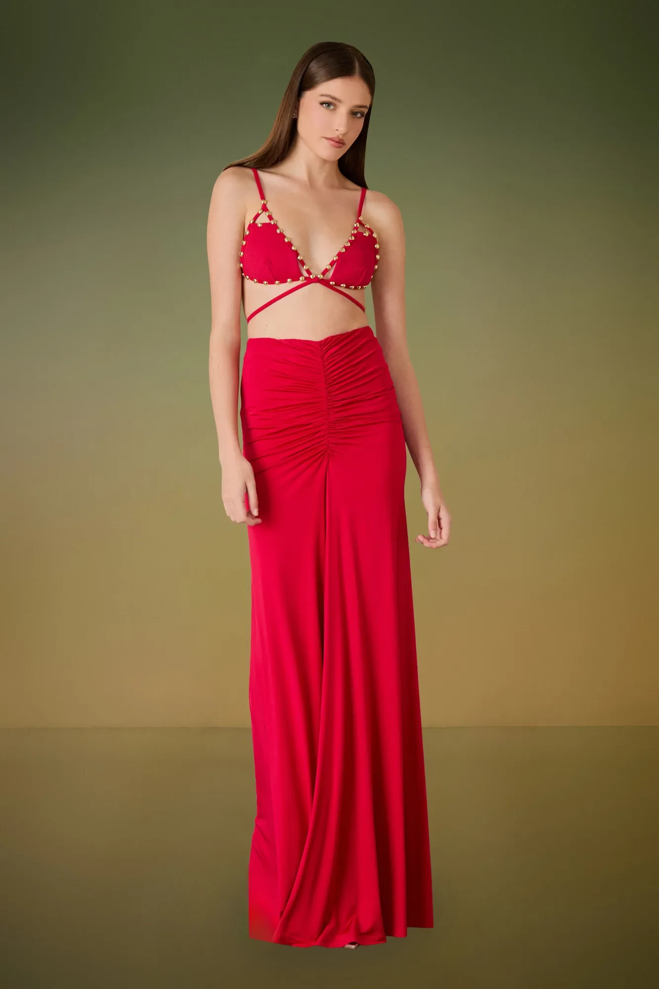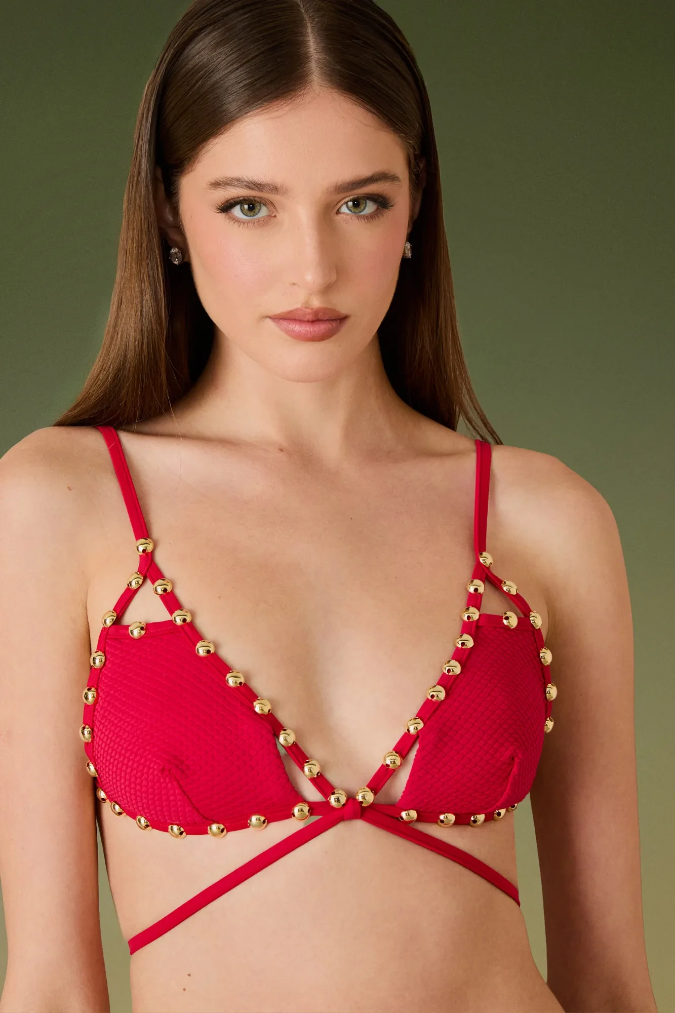 As aplicações artesanais criam um toque de joalheria sofisticado, elevando o biquíni a um beachwear de luxo.