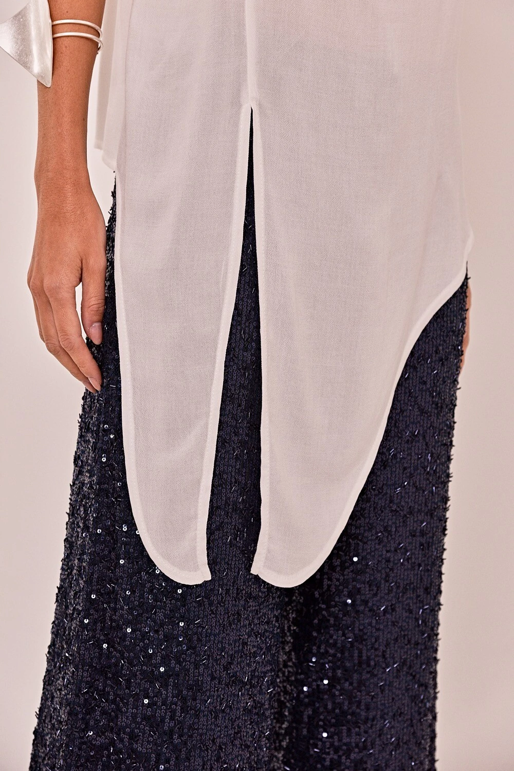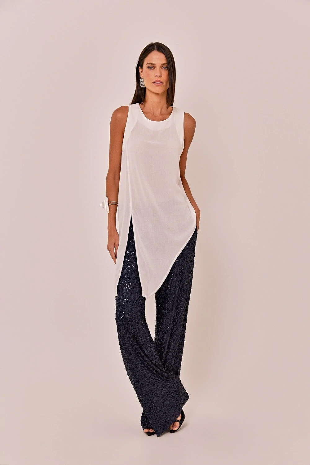 A blusa Rosa é feita em crepe de viscose, disponível nas cores off white e preto. Possui modelagem slim, decote redondo, comprimento alongado e recorte lateral assimétrico.