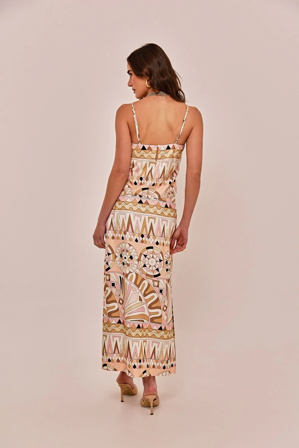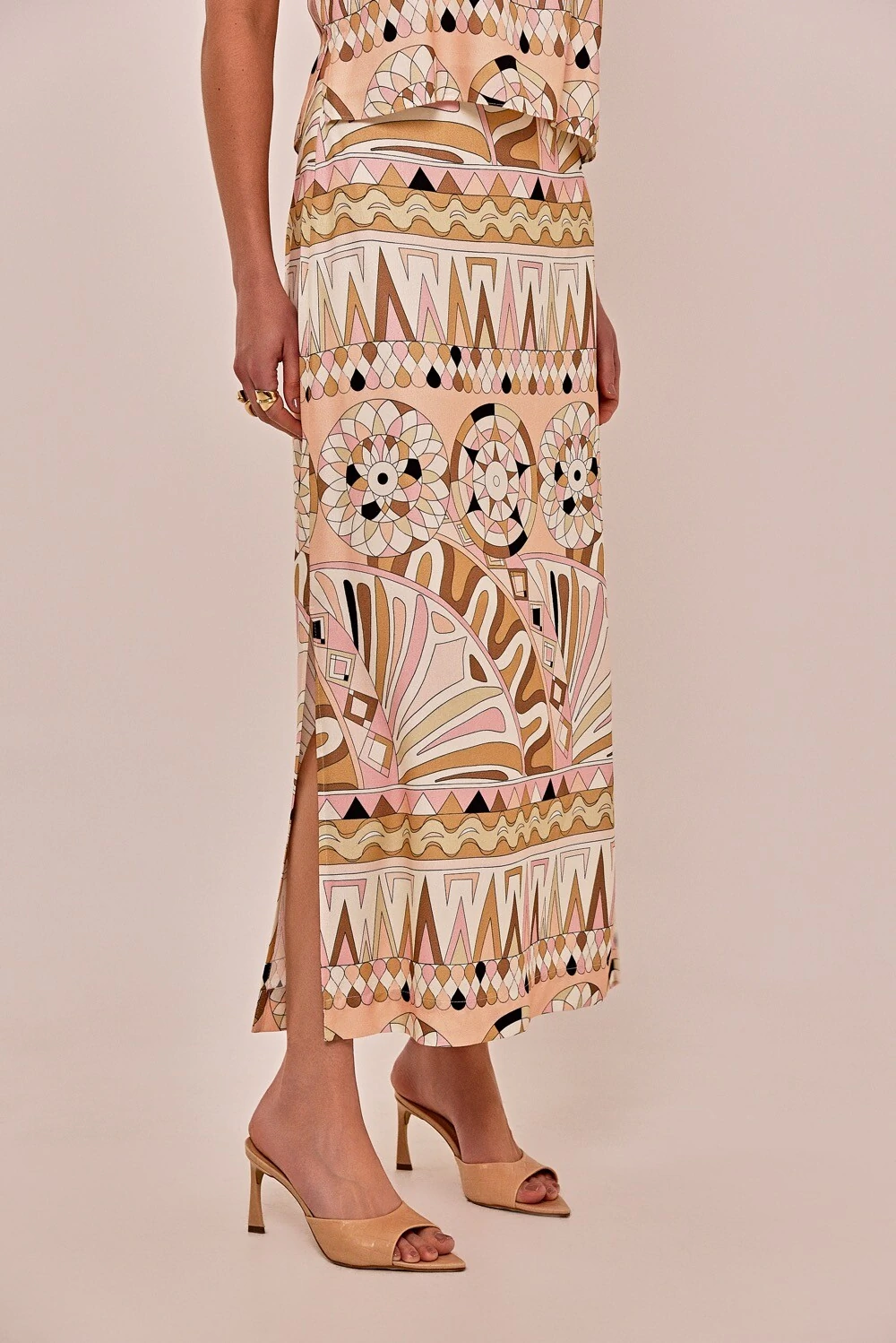 A saia Tina é feita em crepe de viscose estampado com motivos orgânicos em cores pastel, de inspiração Pucci. Possui modelagem slim, cós aplicado, forro e barra simples. Detalhe por conta das fendas laterais, agregando conforto e movimento.