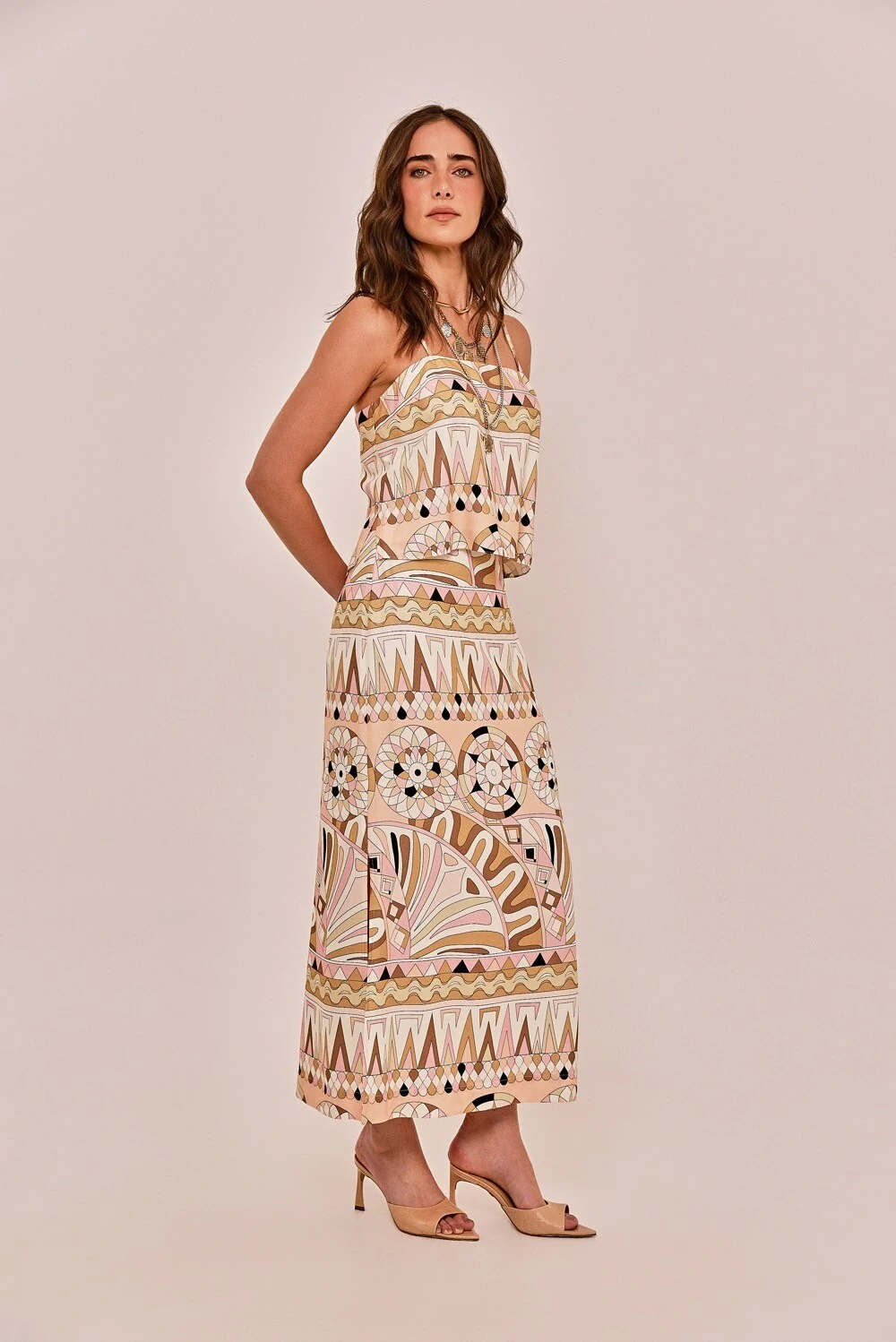 Use a saia Tina com a blusa Tiger em mesmo tecido e cor, e o resultado é um conjunto leve, fresco e cheio de charme. Parte da coleção Barcelona, criada para refletir a elegância moderna, o frescor do Mediterrâneo e o encanto das ruas espanholas.
