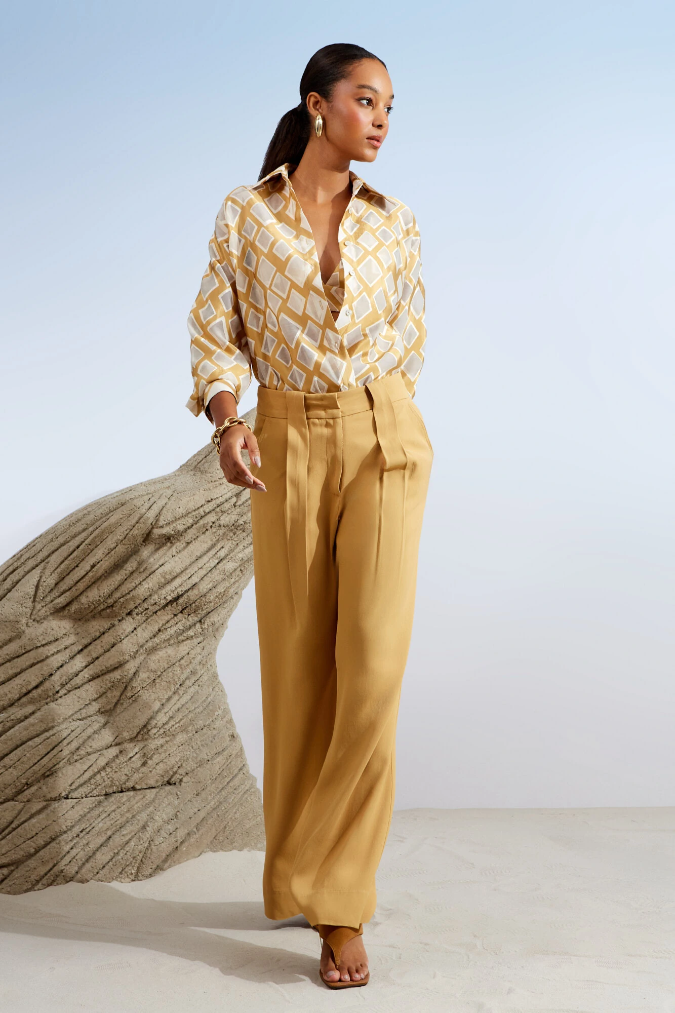 O devorê combina leveza e textura, destacando a estampa geométrica e proporcionando caimento fluido e sofisticado.