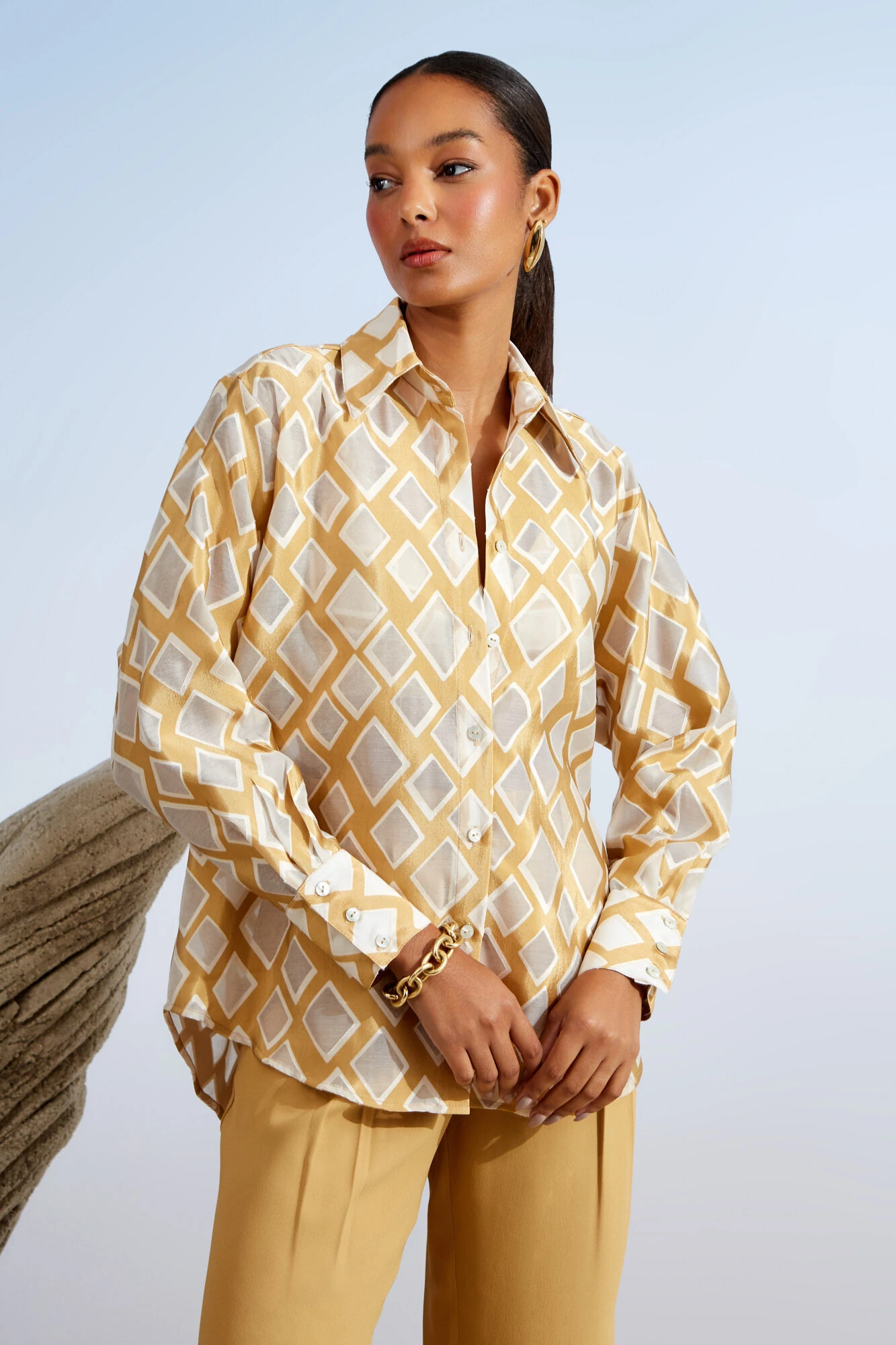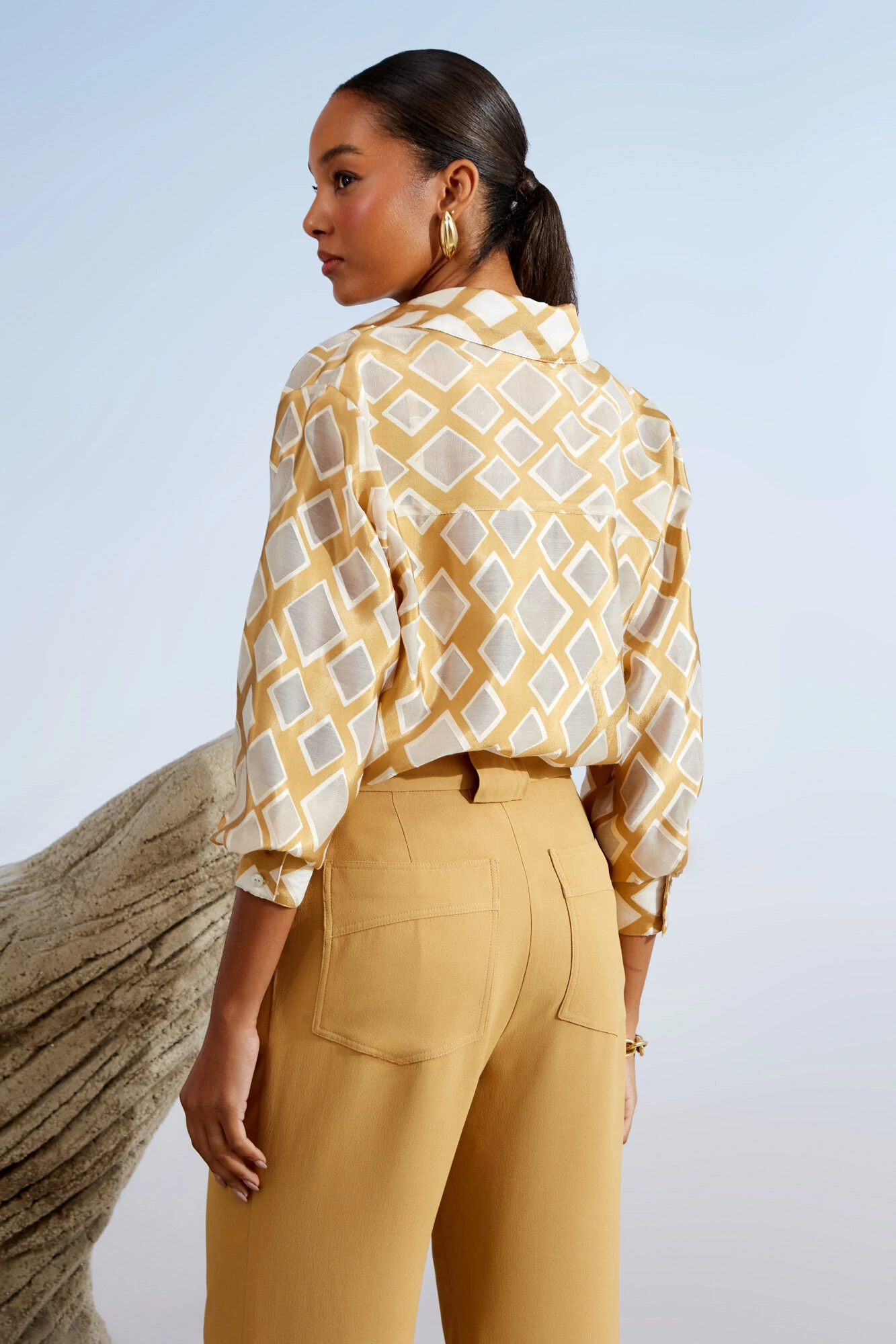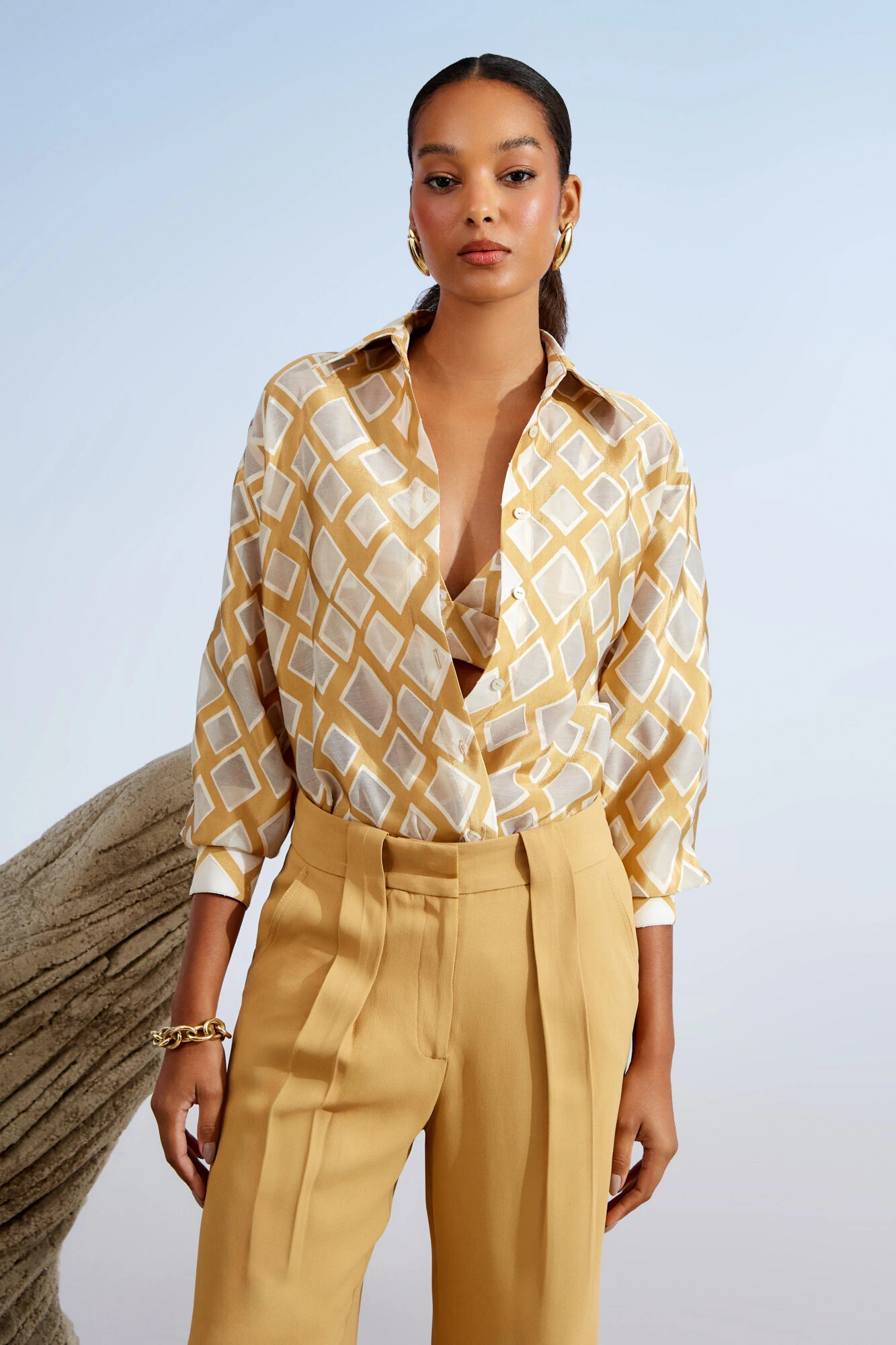Camisa em tecido devorê exclusivo, com estampa geométrica de losangos. Modelo de manga longa, gola clássica, fechamento frontal por botões e acompanha top interno no mesmo tecido.
