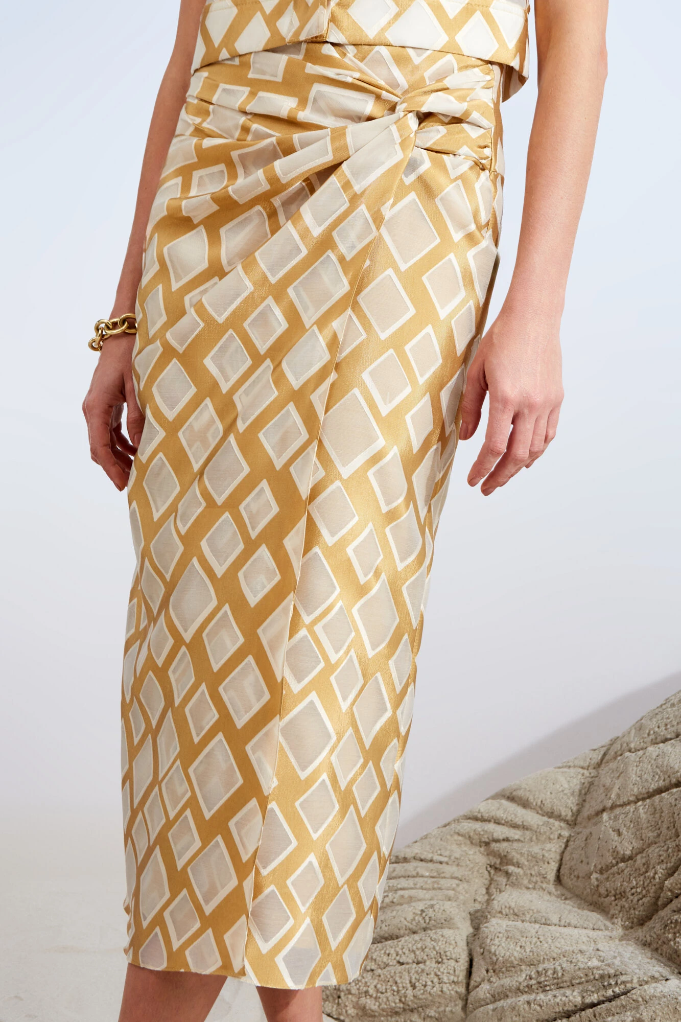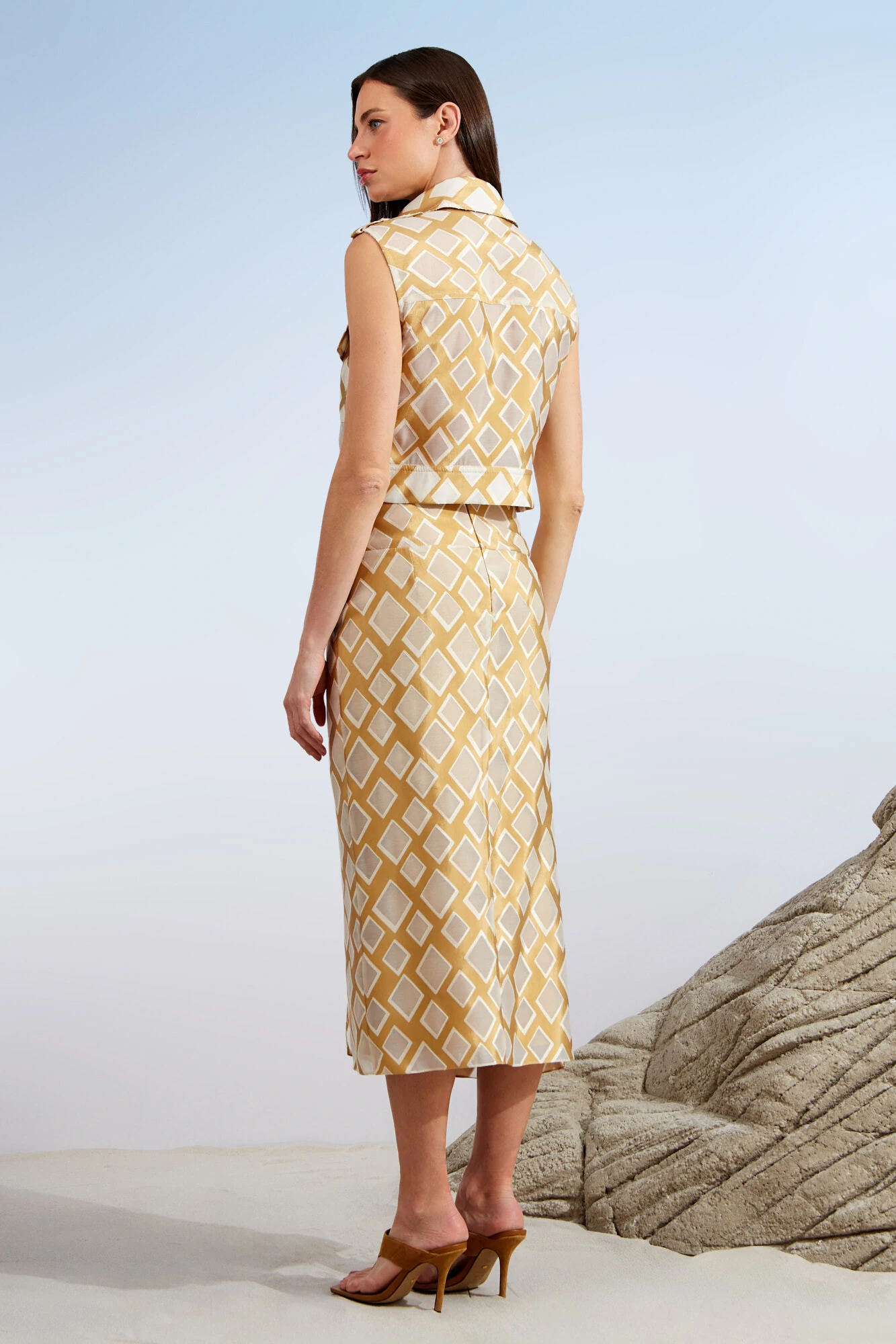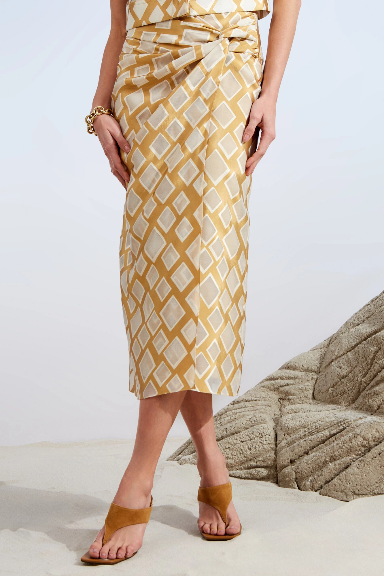 Saia midi pareô em tecido devorê exclusivo, com estampa geométrica de losangos. O modelo transpassado traz amarração lateral e comprimento abaixo dos joelhos.