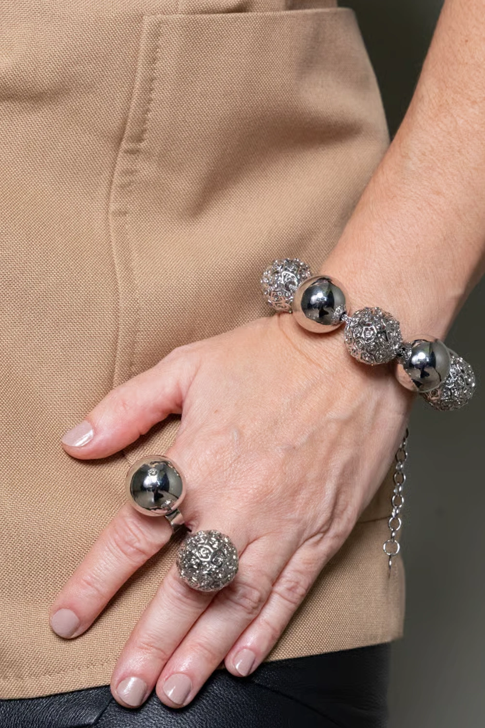 O Anel Kit Esfera Mínimal é uma peça ousada e sofisticada, composta por dois anéis que se combinam para criar um visual único e impactante. Um dos anéis apresenta uma esfera lisa, que traz elegância e fluidez, enquanto o outro possui uma esfera com detalhes de rosetas e pedras, que adicionam brilho e um toque de sofisticação marcante. Juntos, os anéis formam uma combinação moderna e refinada, perfeita para quem busca um acessório que se destaque.