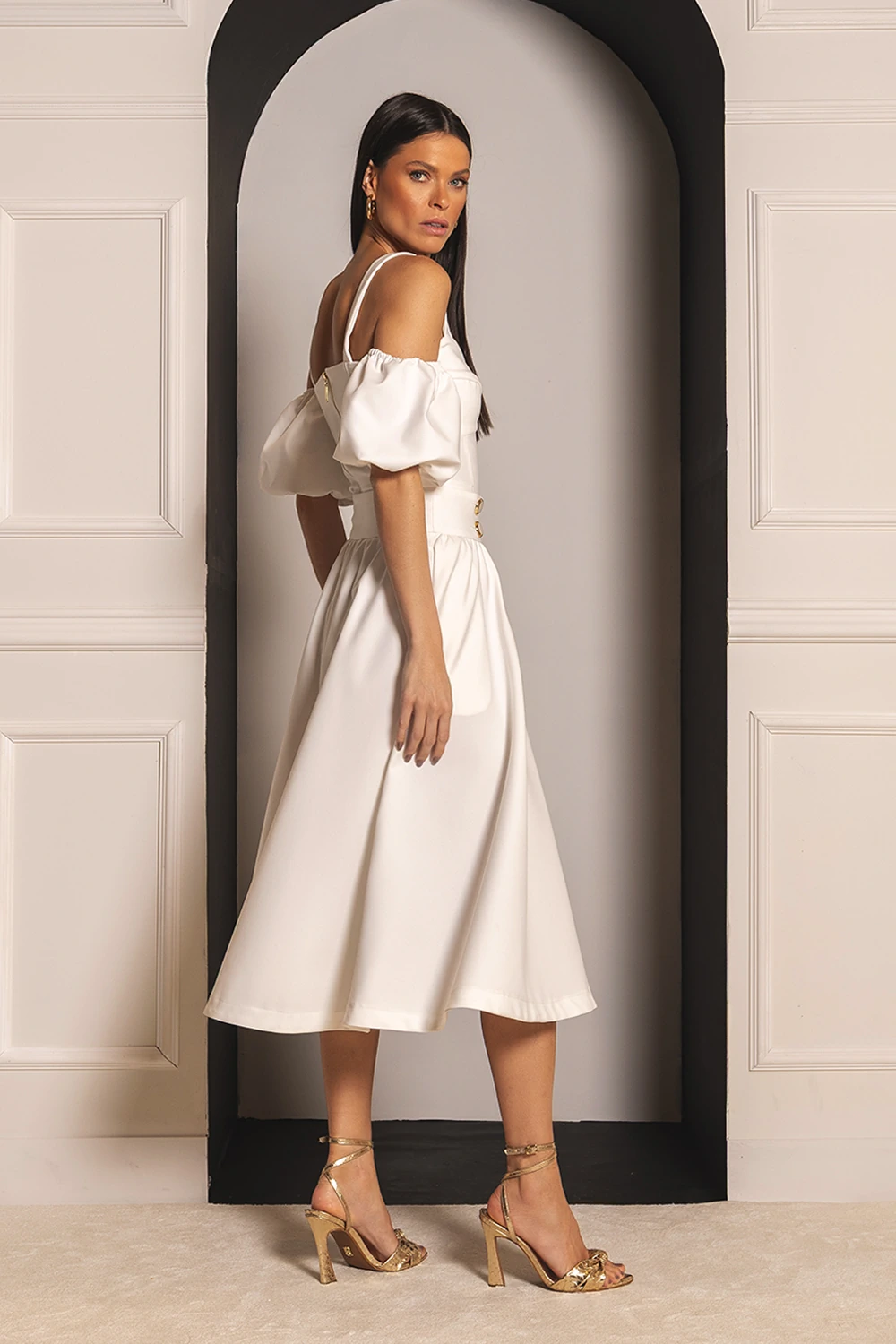 Saia midi confeccionada em alfaiataria premium. Peça com modelagem godê e cintura alta. Possui 2 bolsos frontais funcionais. Detalhes de sobreposição transpassada e franzidos. A vestibilidade frontal é feita por meio de botões. Todos os aviamentos da peça foram exclusivamente desenvolvidos e personalizados Dress & Co.